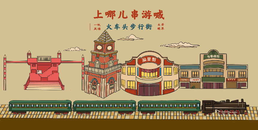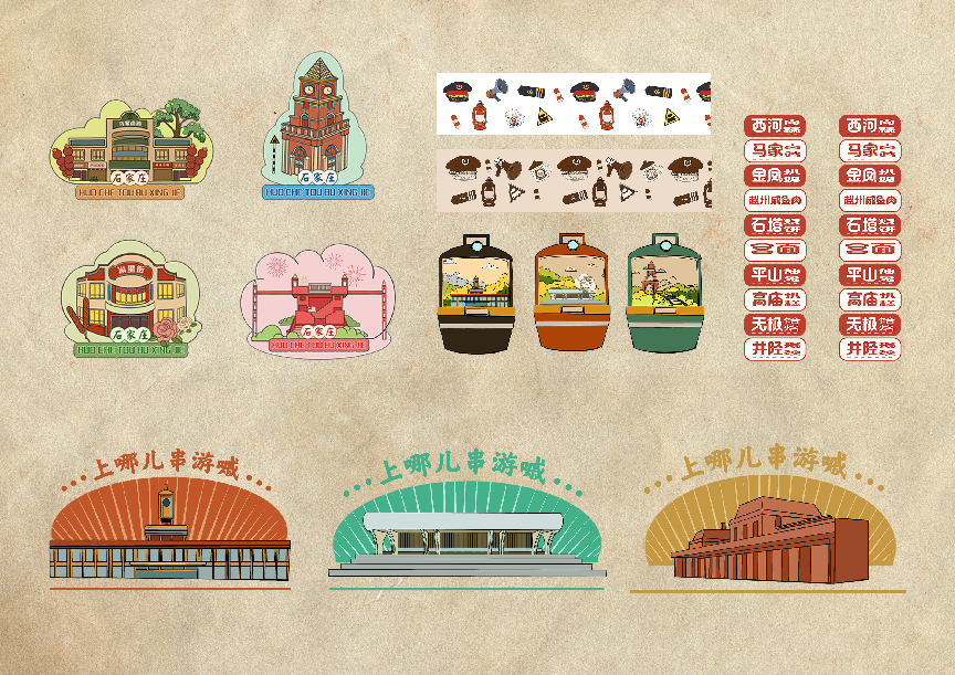 作品简介:在这次的文创中以宣传石家庄火车头步行街和火车文化为目的,提取火车相关元素进行创新再设计,融合石家庄当地的火车文化进行平面视觉设计。