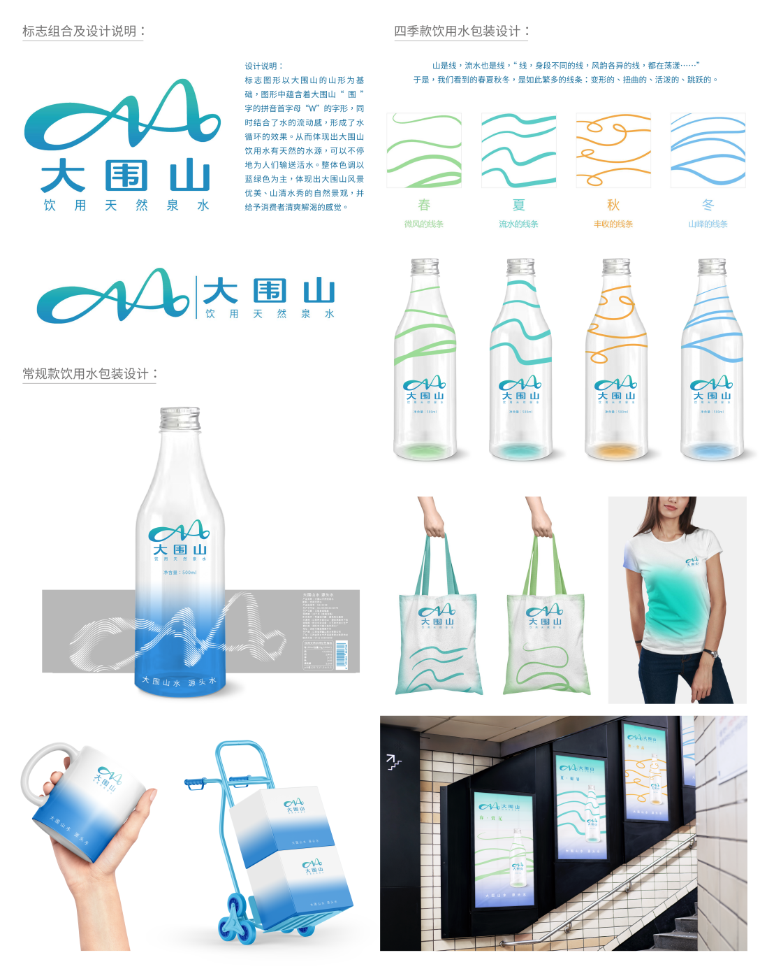 作品简介:该设计的标志图形以大围山的山形为基础,并结合品牌的定位源头水来进行设计,形成水循环的效果。包装则以常规款饮用水和四季款饮用水来进行设计表现。