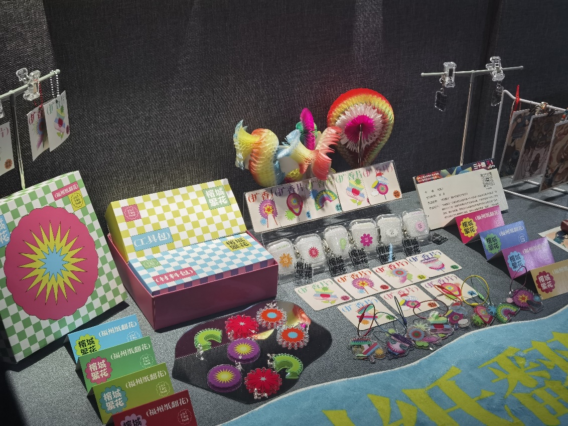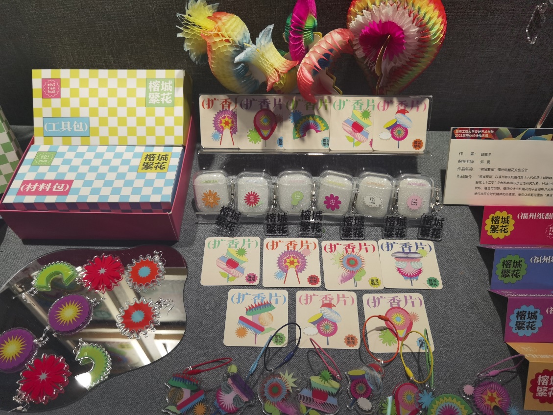 作品简介:“榕城繁花”以福州郭氏纸翻花第十六代传承⼈郭远峰正着手创新的“纸翻花七十二变”的制作和展示技艺为研究对象,对其在结构与形态上进行提炼、融合与创新,概括设计出纸翻花的平面图形并应用到文创产品中,使作品符合时代精神和价值观,意在让纸翻花重新“盛放”,代代传承。