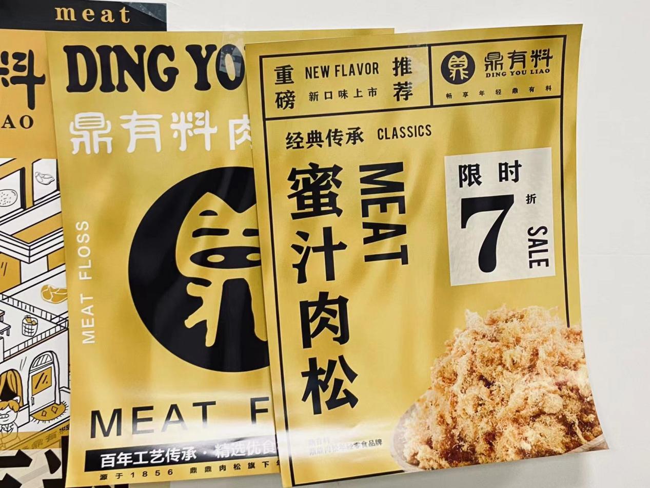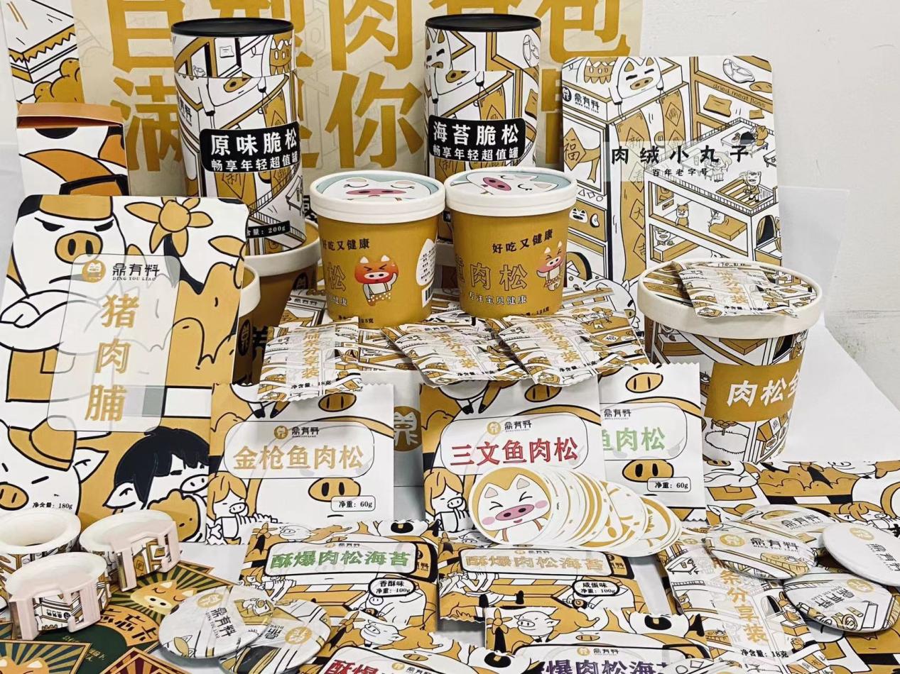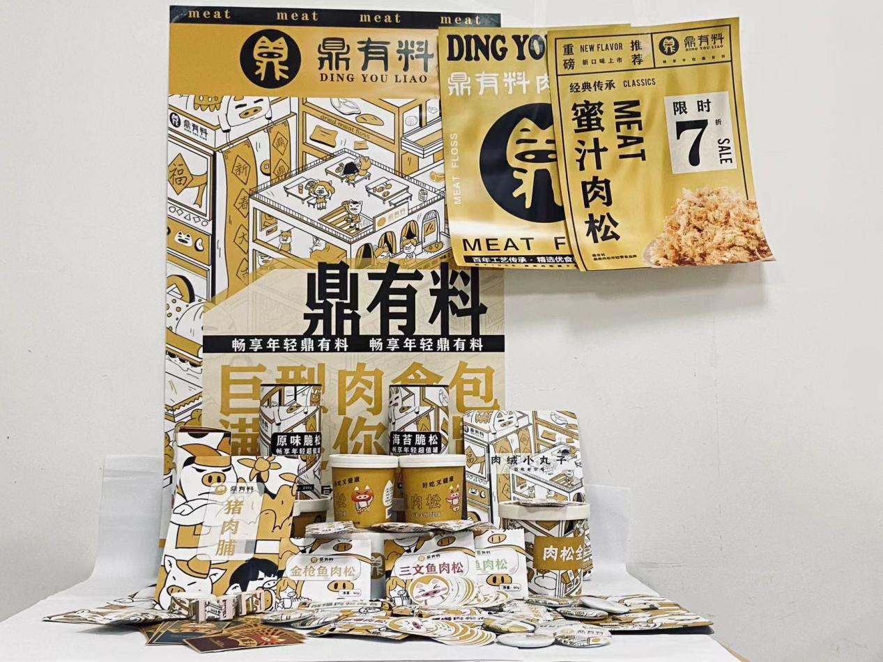 作品简介:鼎有料设计中运用“以小见大”法,对logo主体形象进行强调、取舍、浓缩,以猪鼻子和篆体“鼎”字延伸放大,插画设计中运用“联想法”描绘了一个新年主题的画面,形形色色的小人在零食铺吃肉松,增加了画面的喜感,具有很强的代入感,吸引更多的消费者。