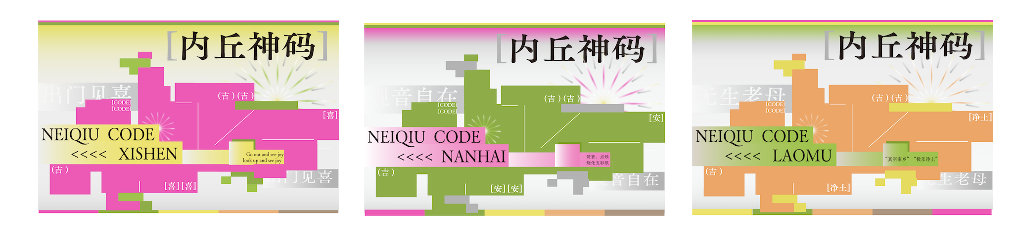 作品简介:本次设计围绕内丘神码来进行文创产品设计,核心在于将内丘神码文化与现代设计思维相结合,对内丘神码的视觉设计进行了深度的重构和创新设计。与以往侧重于内丘神码文化理论分析的研究不同,本文聚焦于内丘神码文创产品的实践设计。我尝试运用现代设计的手法和理念,以全新的视角诠释内丘神码蕴含的深厚文化内涵,力求创造出既保留内丘神码传统韵味,又符合当代审美趣味的图形和图案。