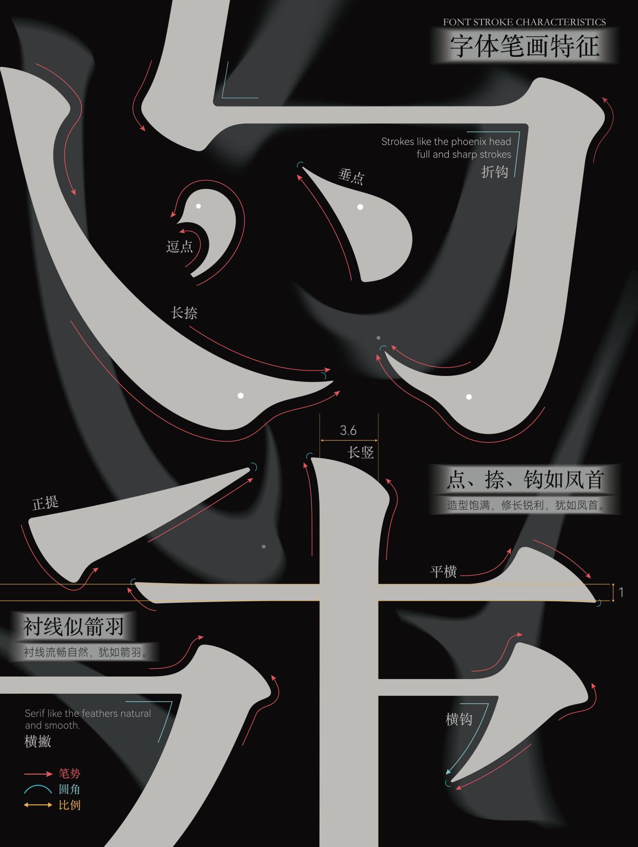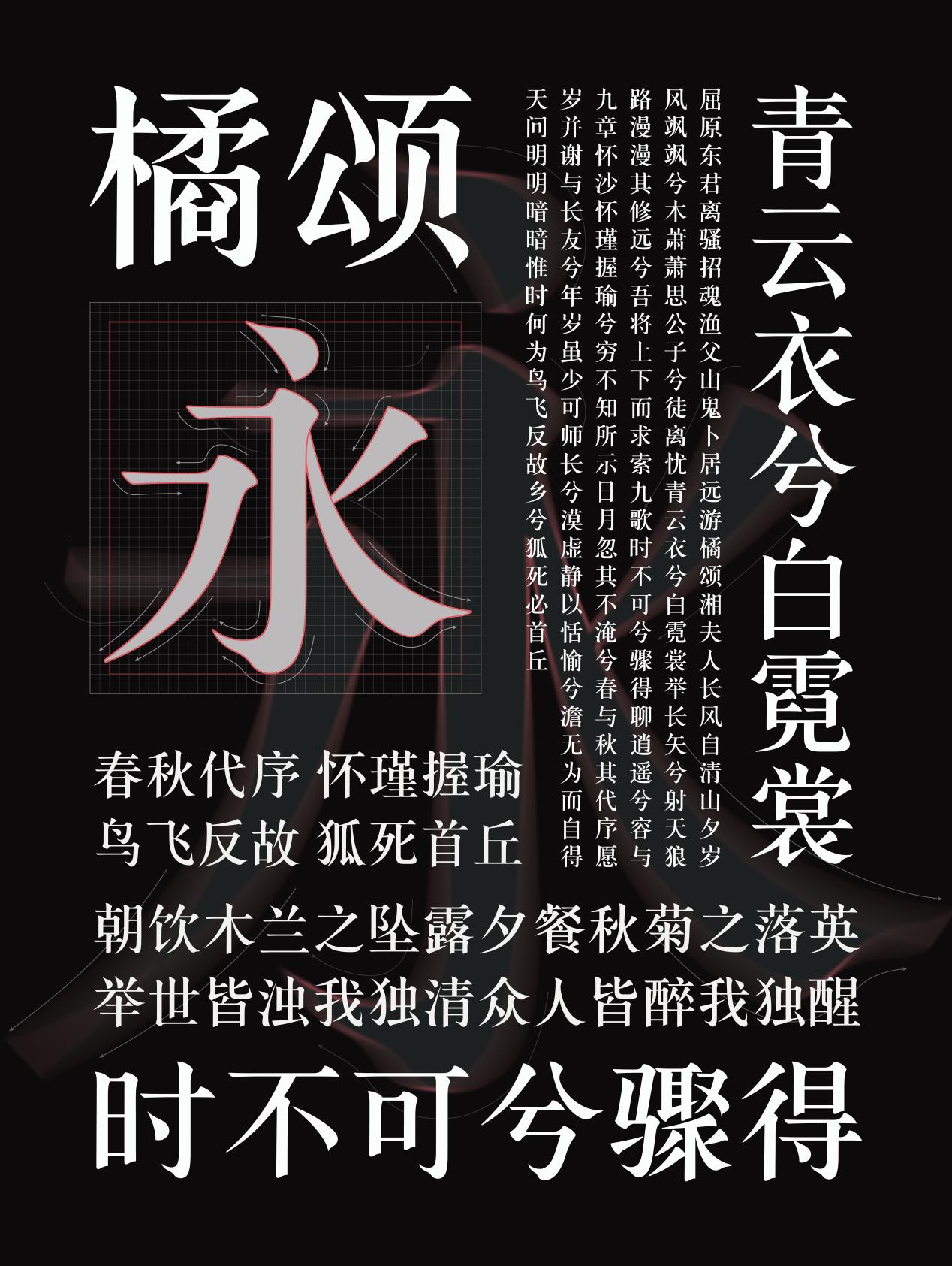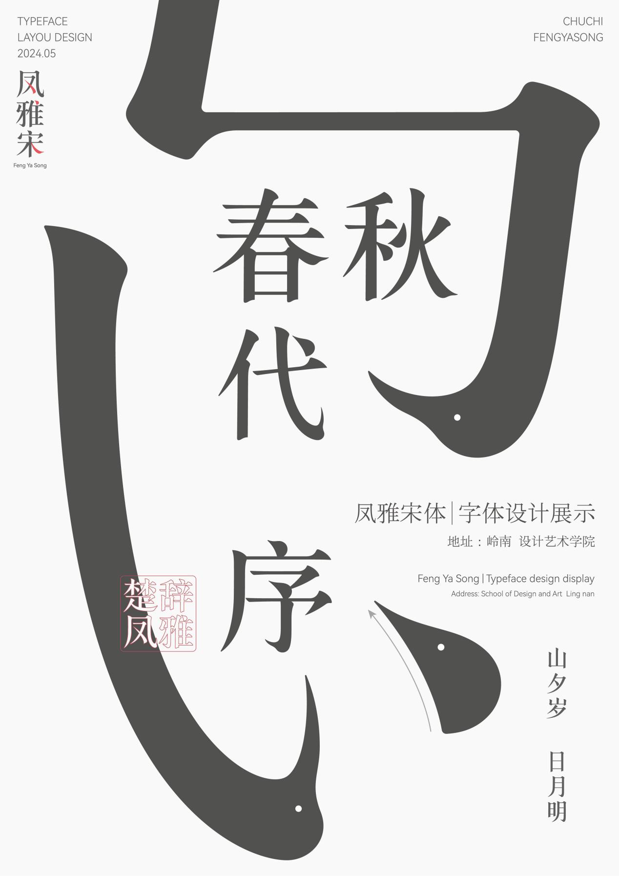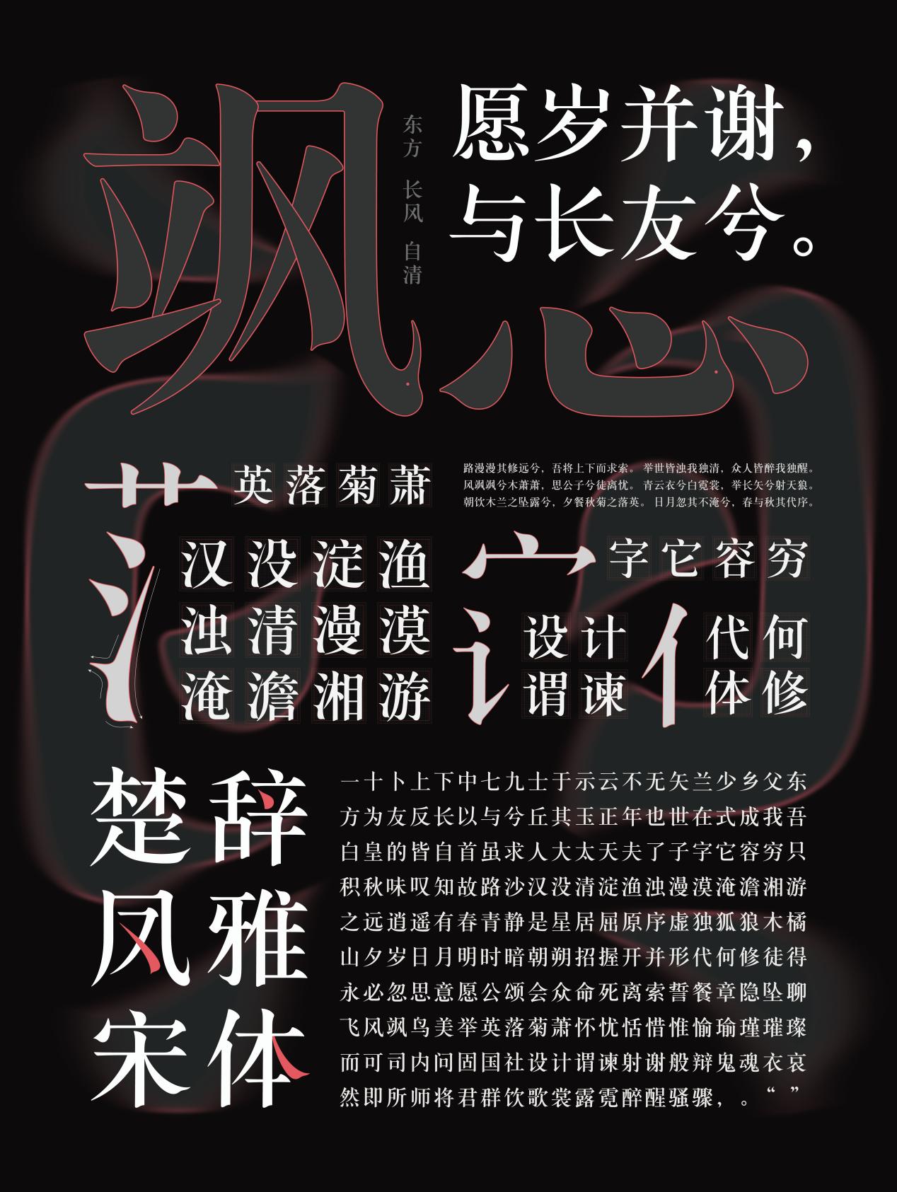 作品简介:楚辞凤雅宋—楚凤纹字体设计的灵感来自战国时期楚国特殊的文化象征凤鸟纹。通过提取楚凤纹的艺术形态特征,结合宋体字,从汉字的基础笔画和字形结构的变化入手,来进行字体创新设计。凤雅宋是一组实用典雅的宋体字,造型方圆结合、笔画饱满流畅,在很多笔画细节处设计了各种形态的凤首元素,该字体适作标题或正文字,用在传统节日、展览表演、民俗娱乐、等场合,来营造文化与复古的氛围。