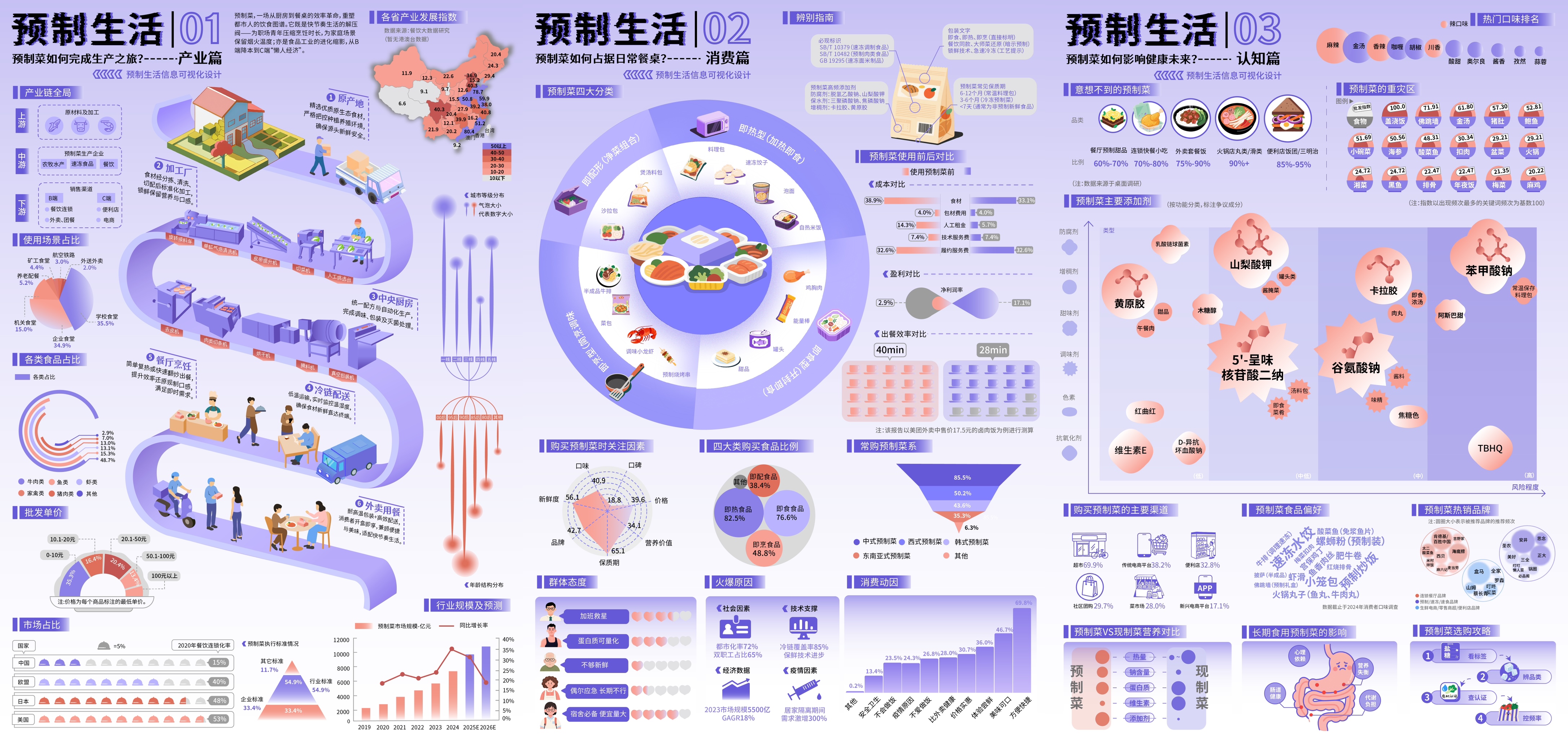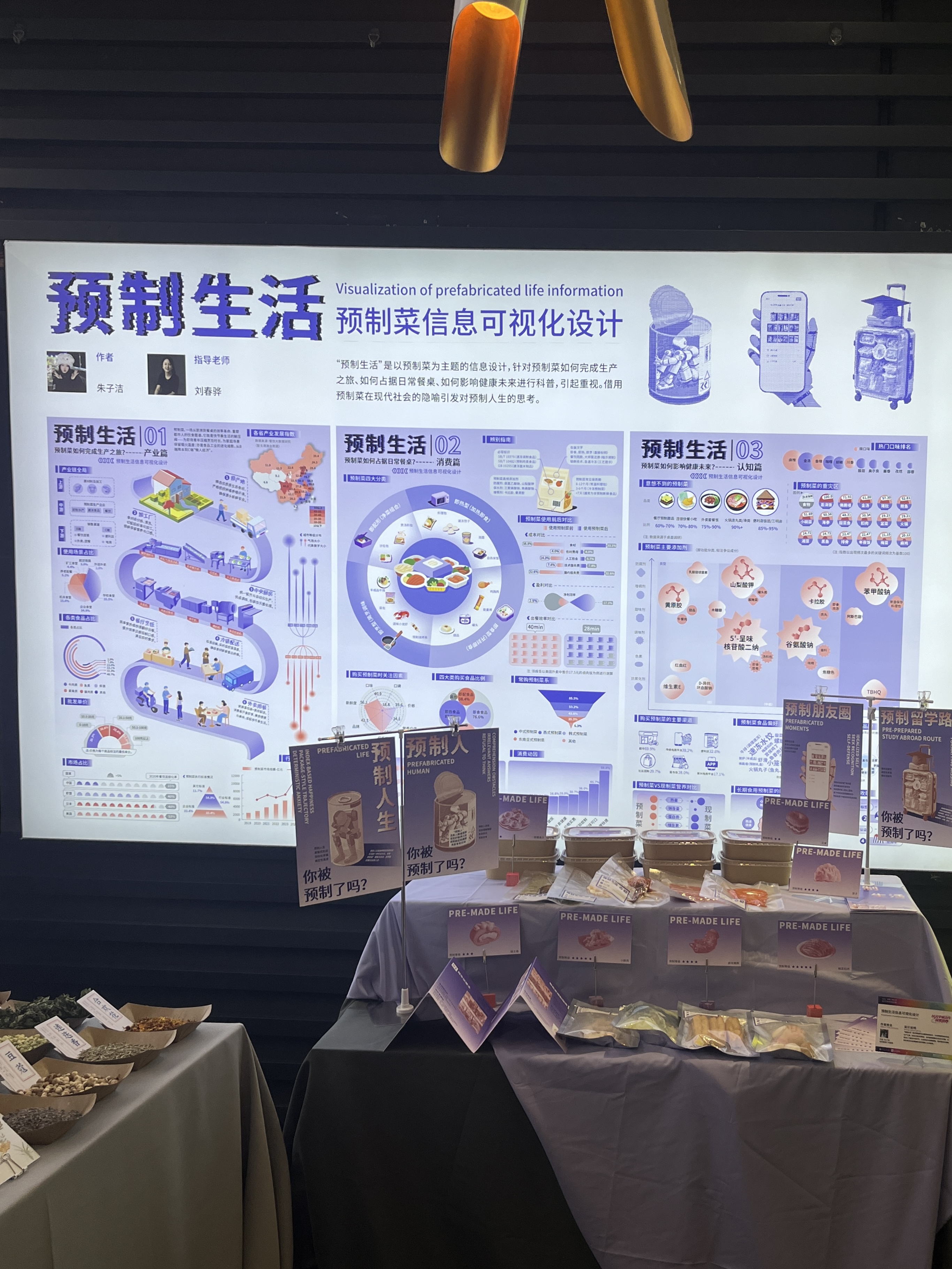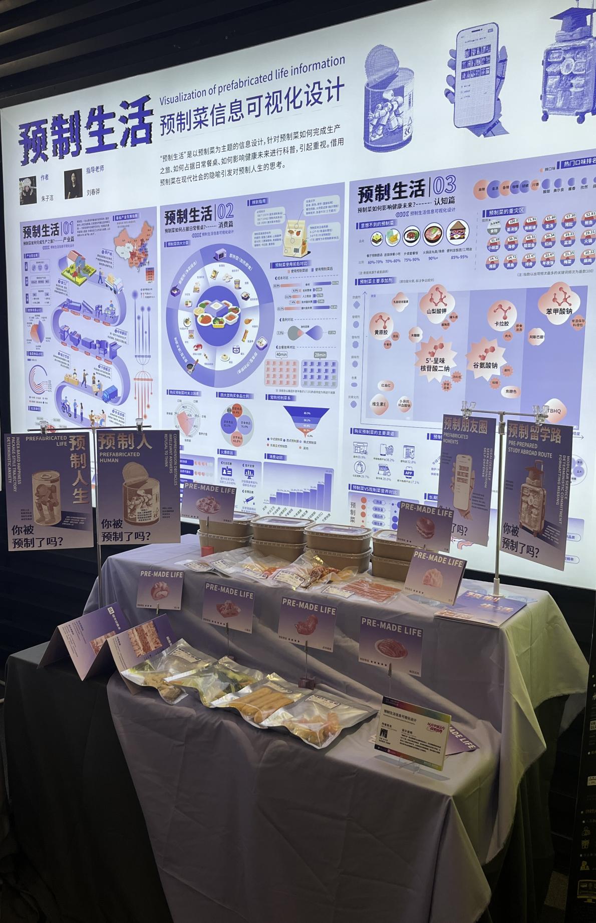 作品简介:“预制生活”是以预制菜为核心载体的社会议题信息设计,针对预制菜如何完成生产之旅、如何占据日常餐桌、如何影响健康未来进行科替。揭露工业化饮食对现代生活的系统性重塑,反映快节奏生活对饮食方式的改变。更多人了解其中的环节,从而辩证对待预制菜。设计以数据可视化与视觉隐喻交织,在预制菜的隐喻之下,引发对预制生活的思考。将“中央厨房效率”映射至“模块化人生困境”——当食物被预制,生活是否也在被预制?