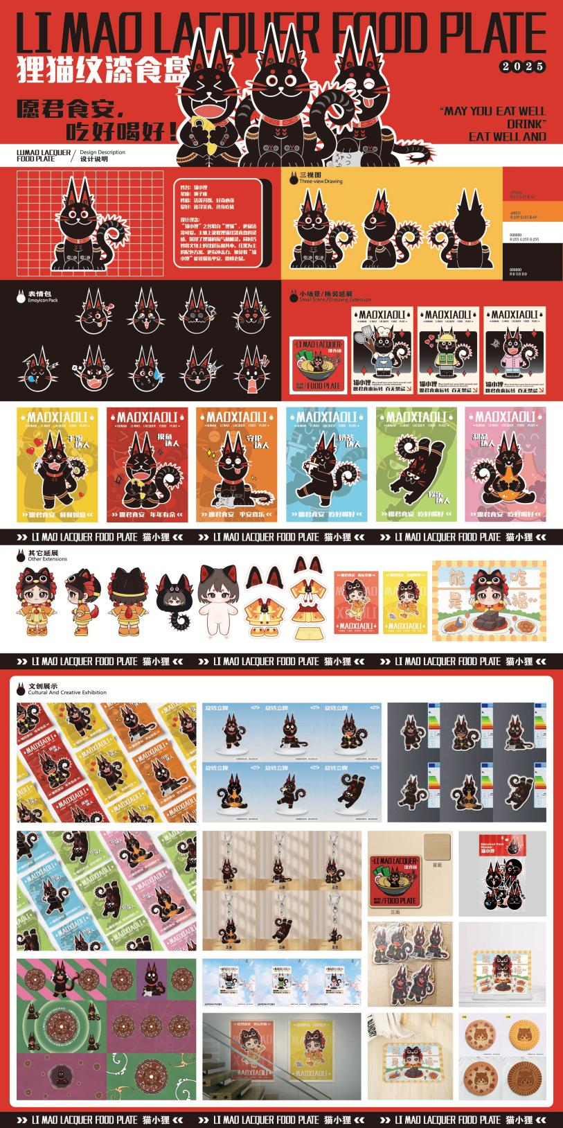 作品简介:本设计以湖南博物院文物“狸猫纹漆食盘”为对象,结合漆器文化传承与创新需求与IP形象设计趋势,以及IP形象在文创产品中的重要价值,设计出“猫小狸”IP形象,并植入美食元素以增强趣味性。并对其进行多维度延展,应用于文创产品与新媒体传播等场景,为漆器文化的创新传播提供可行路径,以年轻化、新媒体化的方式推动漆器文化的传承与传播,丰富文化内涵。