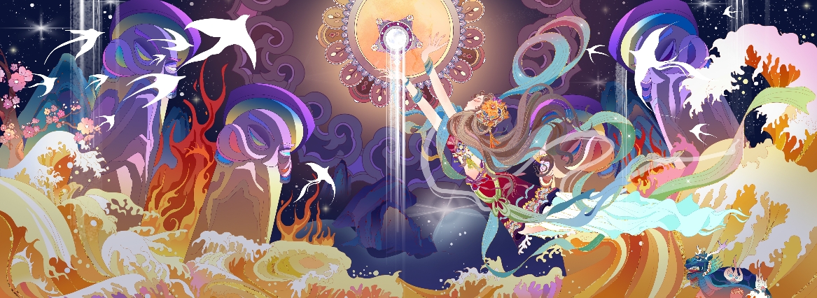 夏英杰作品简介:“梦游创世”神话故事插画设计的目的是为了中国创世神话故事在现代的传承与发展,给新一代的年轻主力军们拥有更多的去了解中国的传统文化和中国的创世神话传说的欲望,感受着她们别样的魅力。设计选取夸父逐日、女娲补天、嫦娥奔月、后羿射日、精卫填海、盘古开天地六个神话传说故事进行新的演绎,用一种新的古风插画设计的形式,从人物形象到构图再到颜色,构建现代插画中新的英雄主义,融合传统绘画语言和现代绘画语言为一体进行创新。