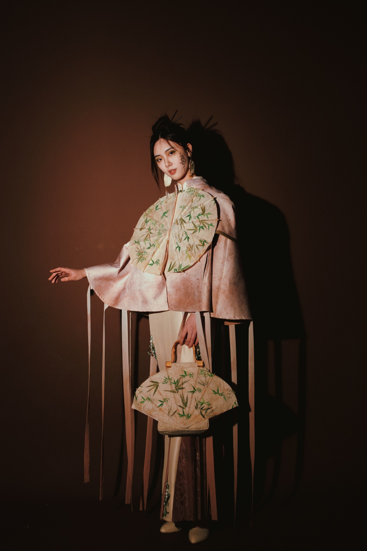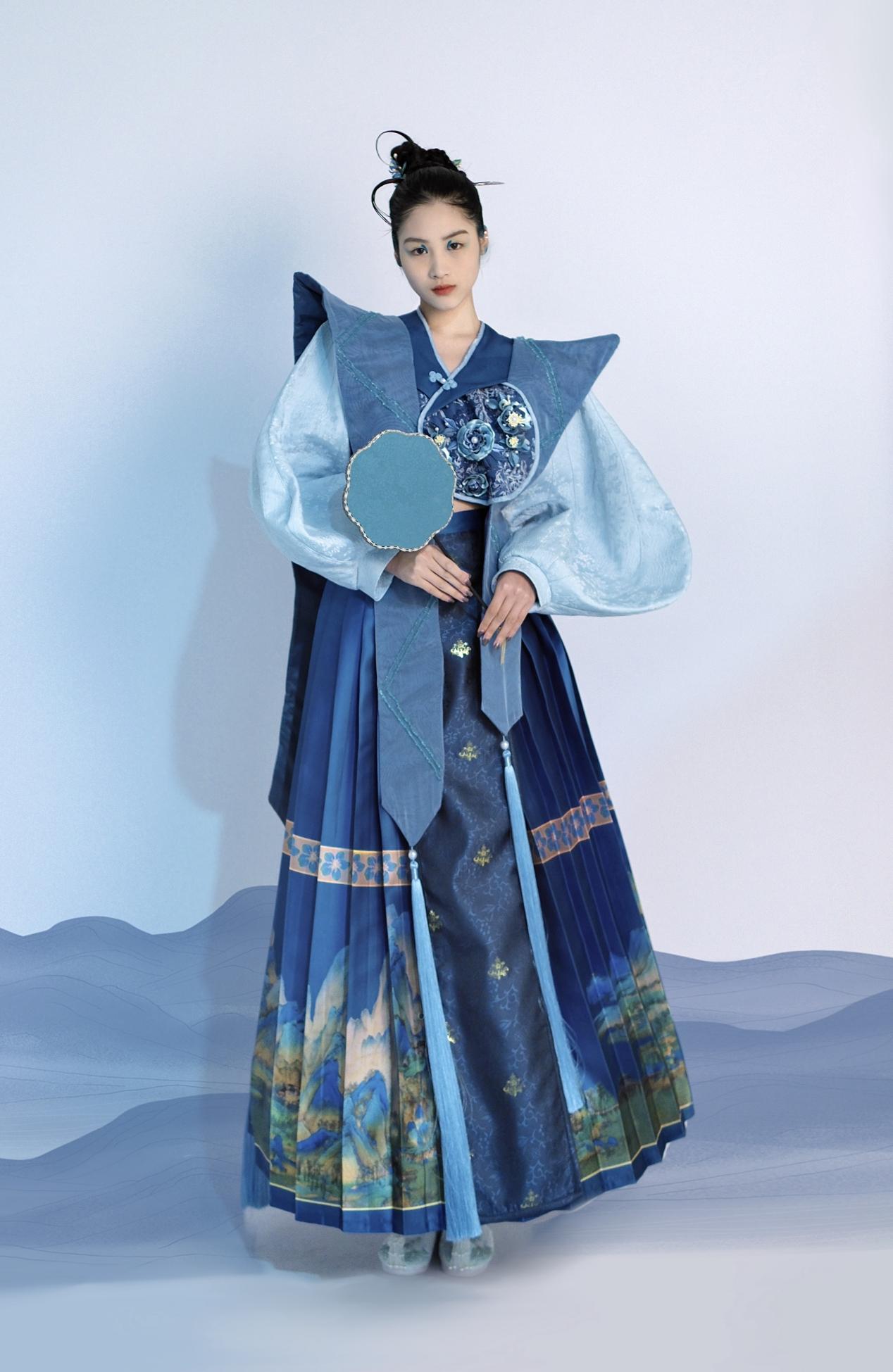 曾雨作品简介:团扇在唐代具有其自身独有的文化价值,社会价值,团扇也在2006年被列入国家级非物质文化遗产名录。“浓黛消香淡两蛾,花阴试步学凌波。专房自倚倾城色,不怕凉风到扇罗。”本设计从团扇古代传统文化的图案和唐代著名画作《唐人宫乐图》、《挥扇仕女图》、《千里江山图》和大量文人古词中提取的元素为灵感,服装造型采用2022年秋冬时尚流行的大廓形外观,结合中国传统文化圆形团扇、花瓣形团扇、长方形团扇和芭蕉式团扇的廓形元素融入设计中,从而得出的服装廓形版,体现国风之美,也是对传统非遗文化的一种传承。