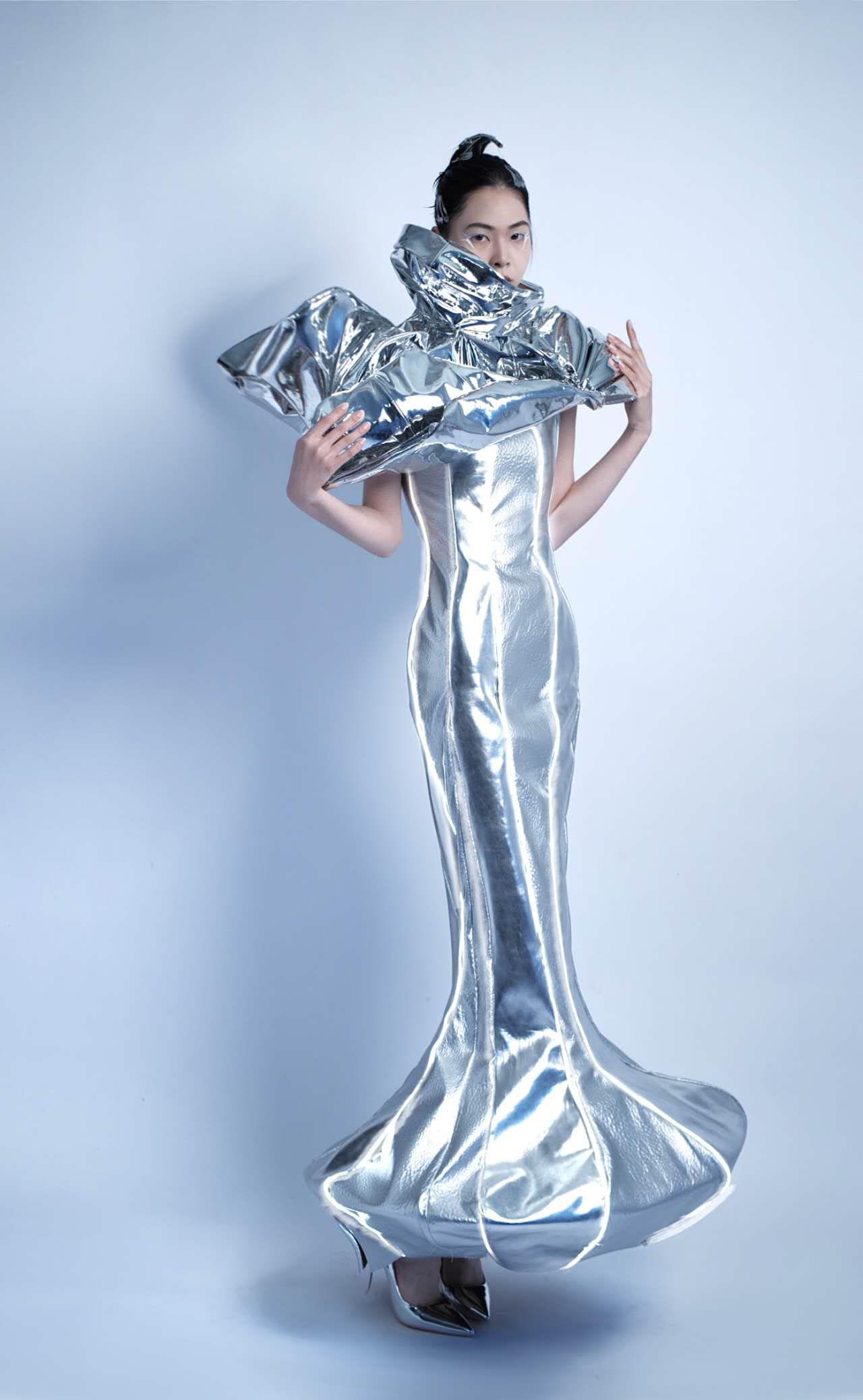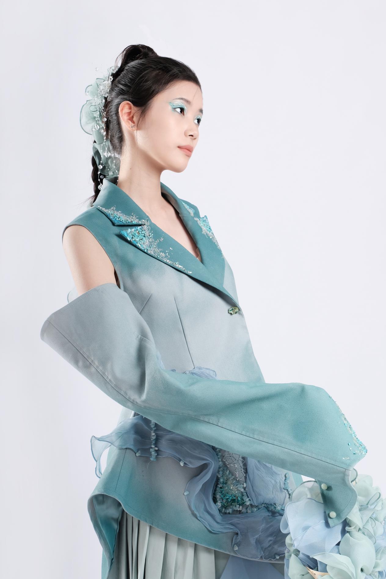 胡依娜作品简介:本系列作品灵感来自深海纪录片《蓝色星球2》,海洋生态问题面临巨大的挑战,人类活动产生的种种问题正在对海洋生命进行威胁,面对这样的现状,我开始思考海洋生态与服装可持续面料的关联。作者以可持续材料和不同肌理面料结合技法的创新为切入点,运用不同的特殊材料,将可持续面料肌理进行改良,两者结合设计出不同的多元化元素,运用于服装结构设计。通过大量的实践操作,探索和尝试可持续面料在服饰结构中的多维度创新应用。
