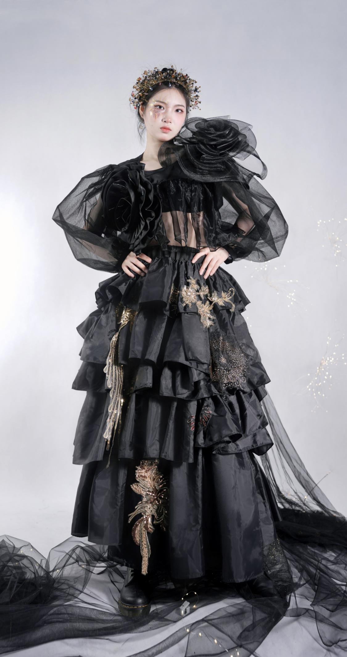 肖晓丽作品简介:烟花象征着转瞬即逝,正是因为容易消散,愈显珍贵。本次设计的灵感来自于能代表浏阳城市IP的浏阳烟花和浏阳烟花的制作技艺,通过浏阳烟花与现代服装设计相结合的手法,借鉴烟花的浪漫色彩元素,以成衣的方式定格烟花绽放的绚丽瞬间。黑色的纱是夜空,缝制在纱上的,便是在夜空中尽情绽放,格外耀眼的烟花。