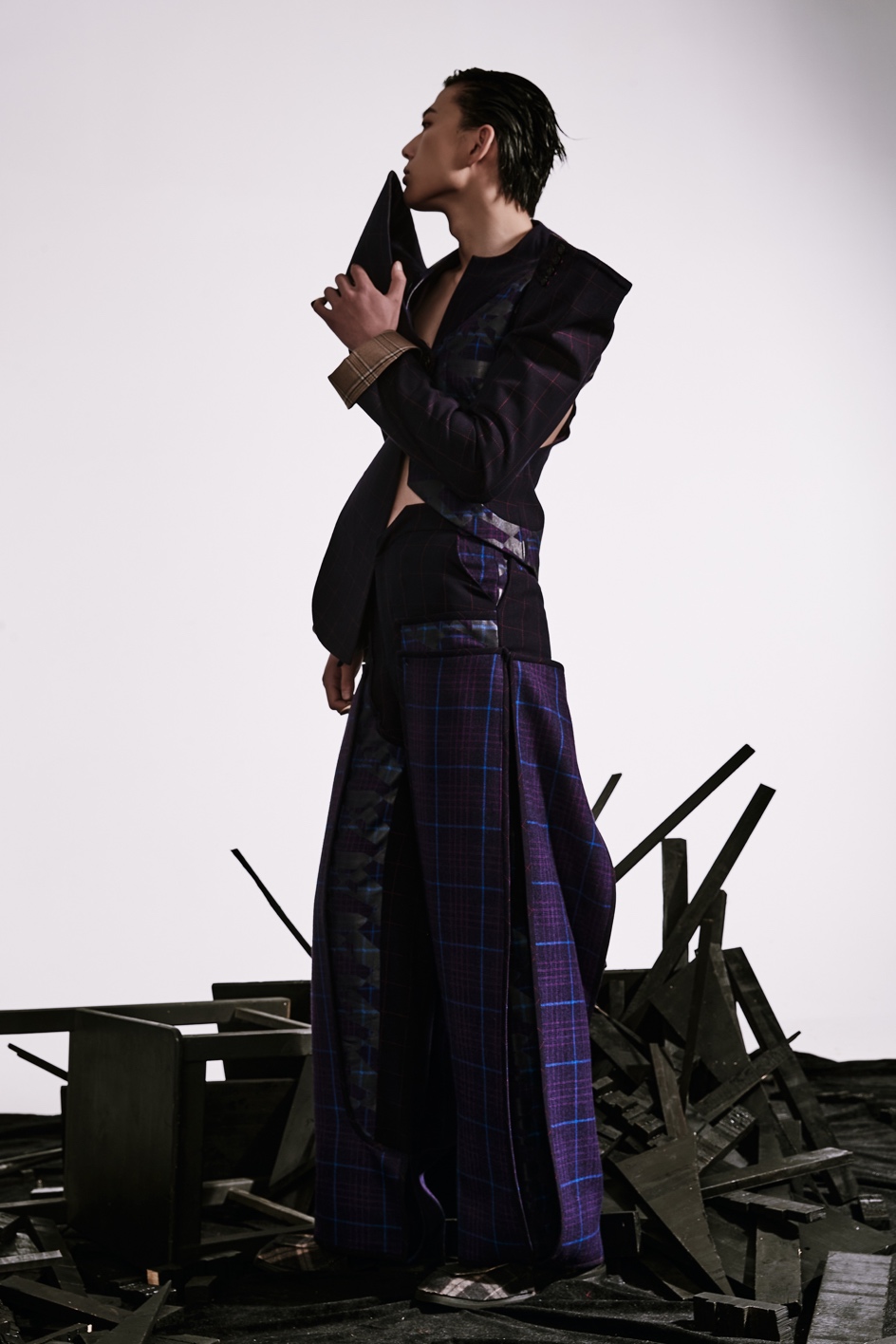 袁颖作品简介:本作品是通过对中医正骨手法的调研与文献研究,用立体裁剪的方式把中医正骨手法延伸至服装结构的转换与应用,探讨在人体特征结构适配的情况下,服装结构设计的延展与创新。从诊疗手段、人体经脉、辅助工具、骨骼等方面先解构再重构的方式进行男装设计,在正骨手法与人体结构的关系中理解和创新人体与男装的关系,同时更深层次的体会男装设计中的结构运用。使其在贴合受众的审美情趣的同时,延展中医正骨在艺术领域的运用。