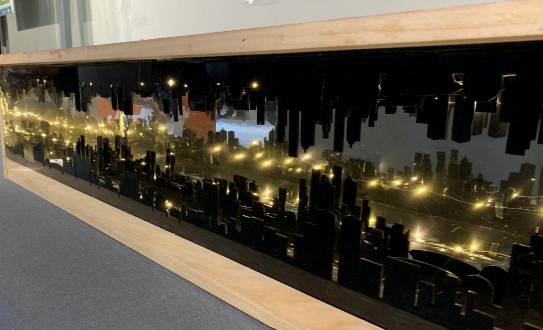 聂红菊 陈雯雯作品简介:本设计是湘江中路地铁站内的公共艺术设计。结合周边实地考察,以“湘江”和“城市”为设计原型,作品的构架正形部分提取了长沙地标建筑为基本框架,镜面负形部分映射熙熙攘攘的人群犹如如万条江海的汇聚,地铁站是交通的空间枢纽,更是人与空间的浪漫邂逅。