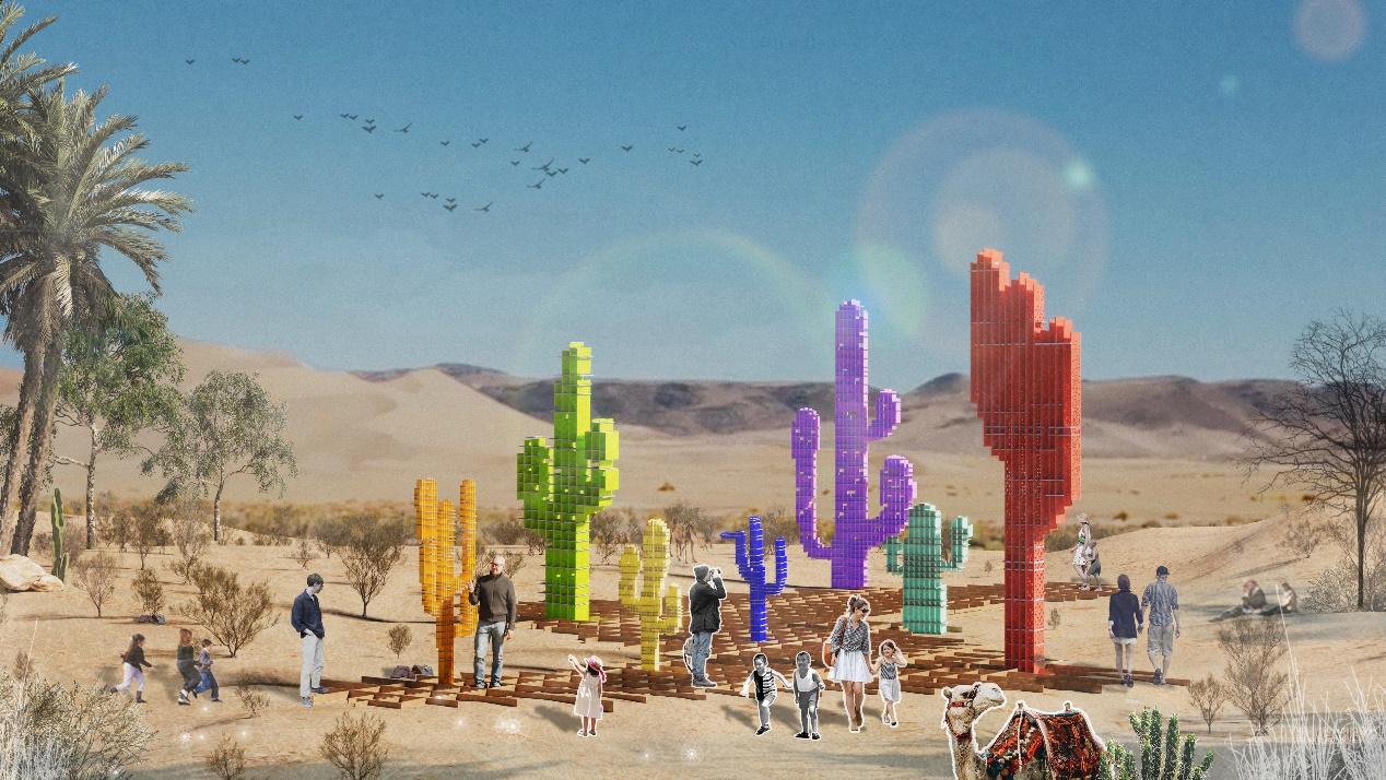 吴飞营作品简介:民勤县被腾格里和巴丹吉林两大沙漠包围,自然风光独特、文化底蕴深厚,根据民勤地域特色进行沙漠公共艺术创作。向全世界展示民勤独有的地域特色,彰显民勤生态治理成果,传承保护防沙治沙文化,此装置通过可以在荒无人烟的沙漠里生存、不向命运低头永挺腰杆的“仙人掌”的形象和新时代自强不息、奋勇拼搏的默默治沙的广大民勤劳动者形象赞颂民勤沙漠的劳动者。做到视觉上“可观”,体验上“可游”,增进了空间活力和观众的参与度。饮水当思源,乘凉不忘栽树人。希望通本设计让枯燥的沙漠充满人文的光辉。