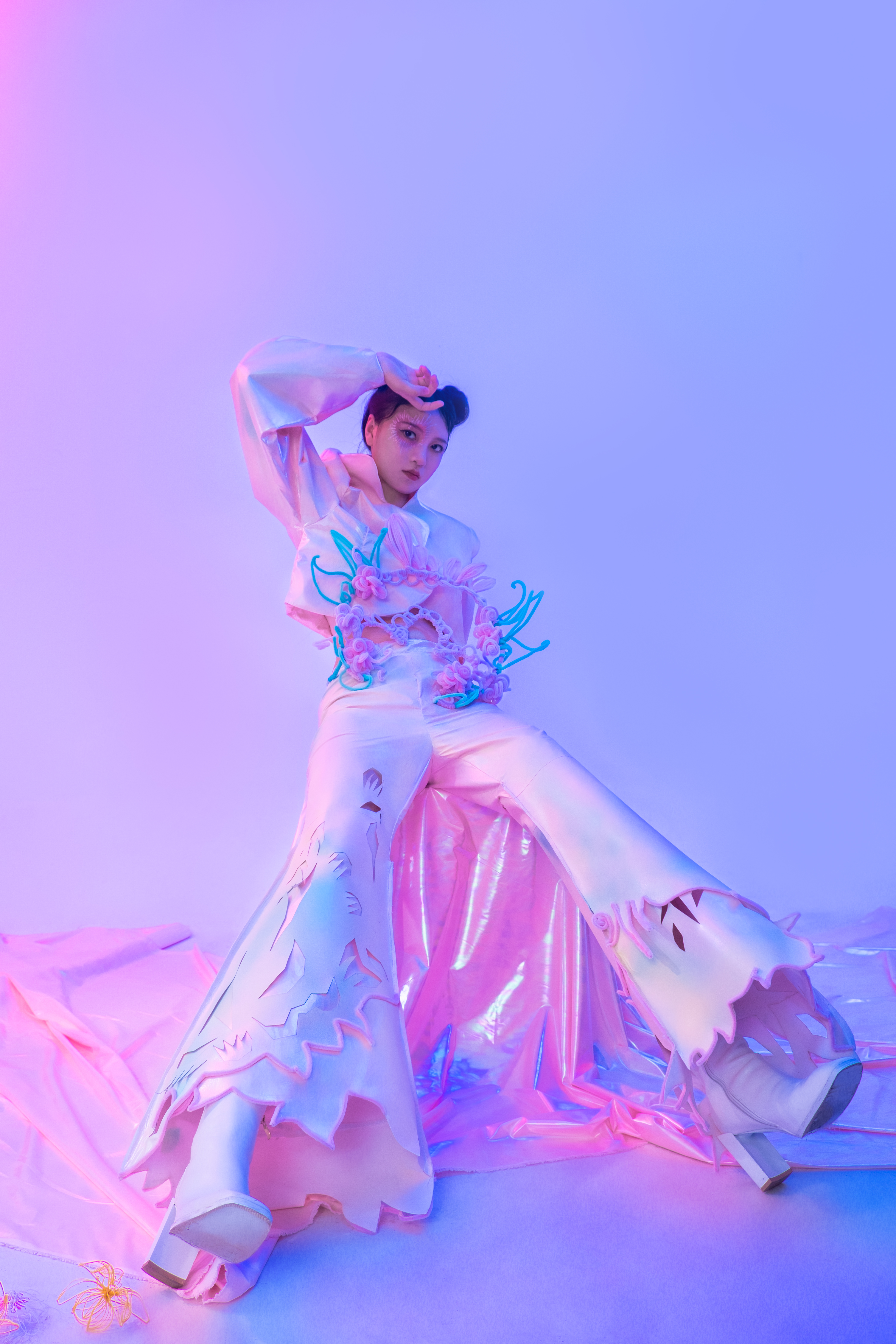 范楚依作品简介:“楮可制纸色白故名楮知白”,本设计意在借剪纸文化描绘春日美景在中国的剪纸艺术,运用多元化的材料,实现蔚县剪纸与其他材质的碰撞与有机结合,赋予剪纸文化时尚与现代感。打破传统纹样的框架,将剪纸纹样进行提炼和创新,形成具有个人特色的因素并运用在服装上。
