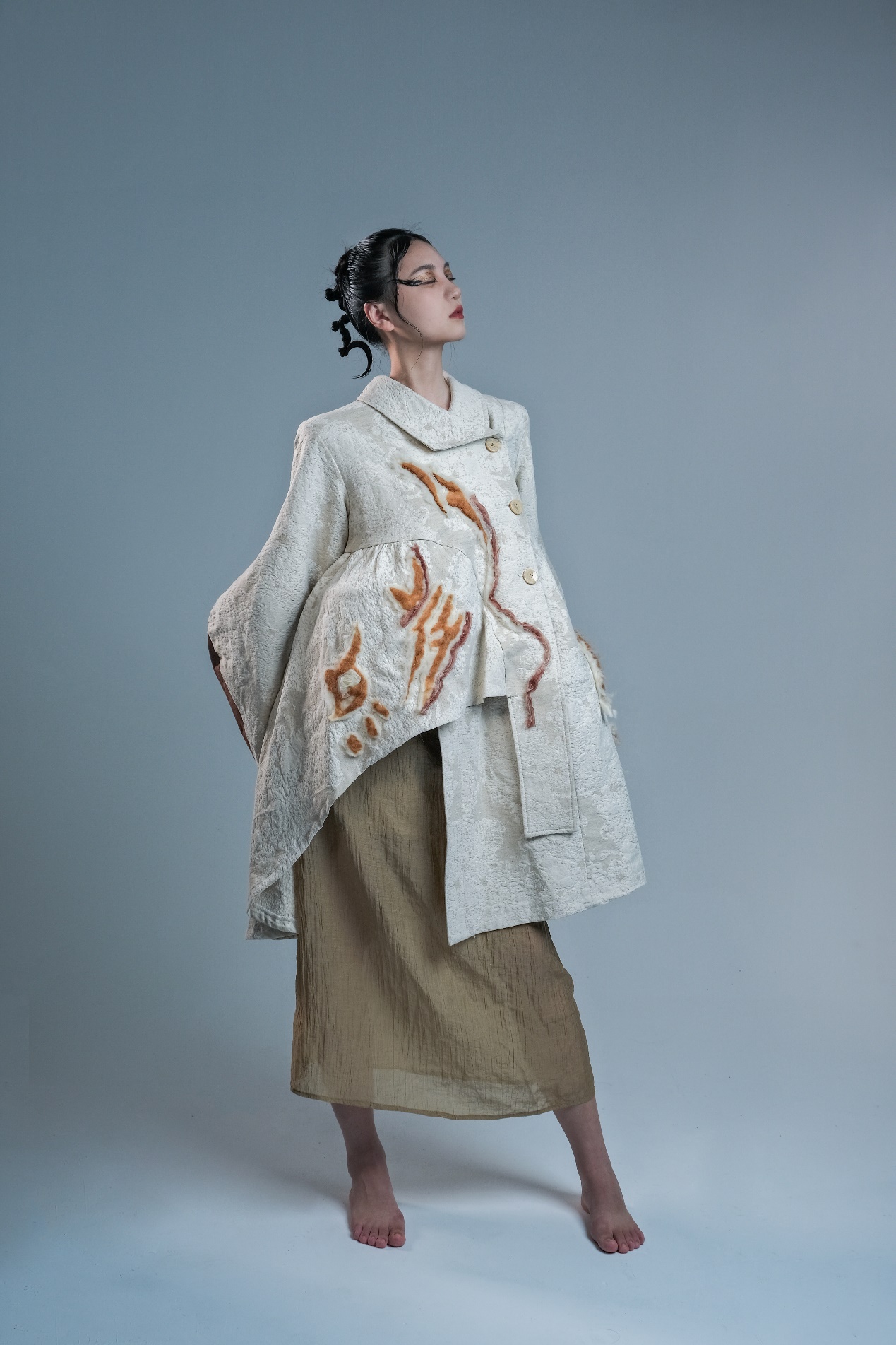 雷湘云作品简介:本次创作的设计围绕女书的所蕴含的精神内涵以及审美价值,在面料、工艺、色彩和廓形方面进行设计。通过对女书文字符号以及将神内涵的分析和提取,其进行图形化设计,应用于服装的图案和纹理中。通过羊毛毡对女书图案的表达,增加服装的氛围感。这不仅是女书文字符号运用的创新,也是对现代设计手法和民族文化艺术结合的探索。