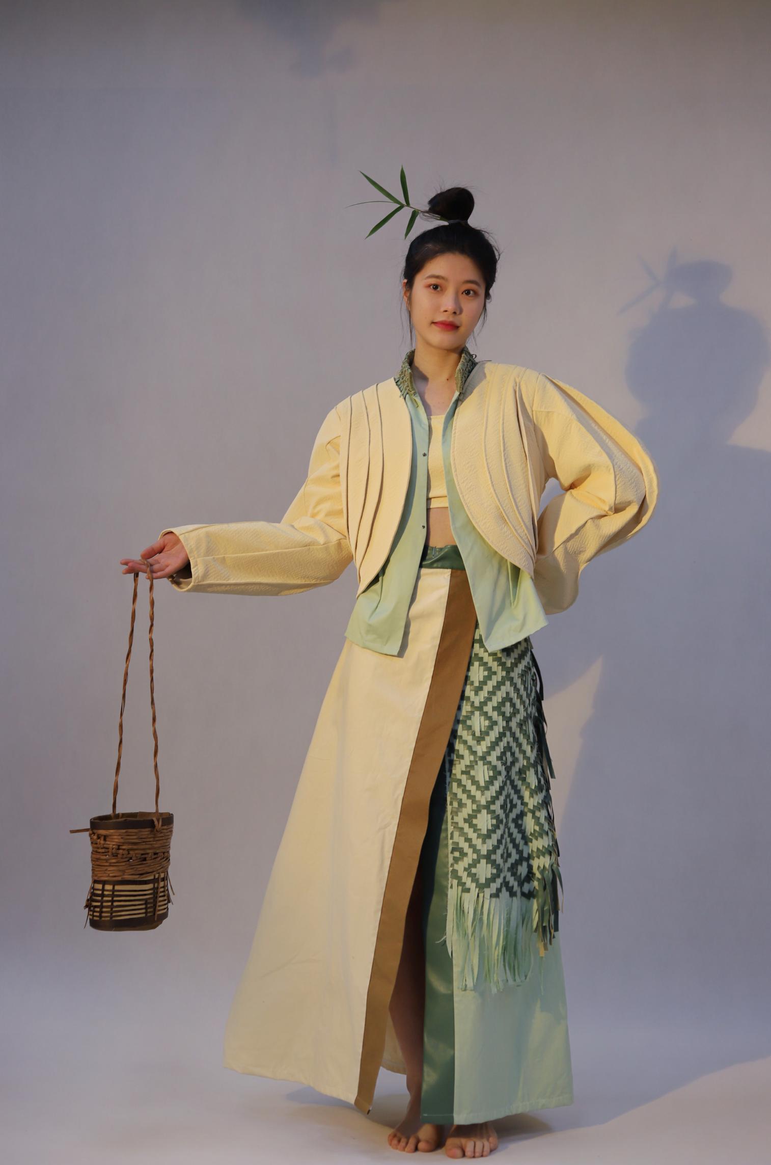 谢丽利作品简介:本设计以端午为灵感来源,重点以端午民俗为主,结合现代流行趋势,将从端午习俗文化提取的创意元素在服装廓形、色彩、工艺等方面进行设计创新。服装主要以粽子廓形,粽叶纹理元素表达,面料用艾草进行染色,再运用五色绳编织元素进行设计,在新时代运用新的表现形式去传递端午节中蕴含的丰富文化内涵。