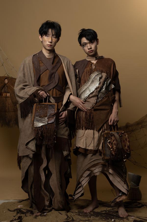 杨燕宇作品简介:“鱼皮衣”是中国赫哲族的传统服装中最具特色、最有代表性的服装,却具有很强的艺术性和实用价值,潜藏着丰厚的人文含义。但因精湛的鞣制技术制作复杂,目前基本面临失传。要让赫哲族鱼皮衣这个宝贵的非物质文化遗产在世界上传承下来,需要融合更多的创新元素。研究主要通过网上调研,大量搜集鱼皮衣的资料,深入了解赫哲族鱼皮衣的制作过程,工艺手法,现代价值,购买鱼皮,进行面料上的研究,探寻鱼皮衣在现代服装中的性能。