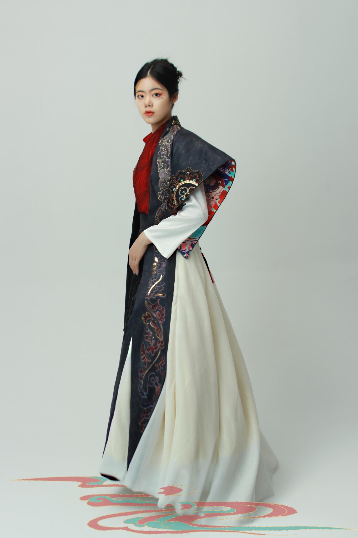 王玲作品简介:服装工艺的制作需要很多的步,通过前期的大量收集资料、面料改造、设计稿图、样衣制作后进行成衣制作。在面料的裁片上添加了纸衬,使服装面料更加挺拔。根据白胚样衣的不足之处进行修改调整,首先将印花图案设计稿送去印花厂,服装裁片进行图案热转印、绣花、面改,最后缝合起来,制作成衣。在成衣上添加法绣绣片与各种面改,增加服装细节与立体感,在制作过程中根据面料效果适当调整面改范围。