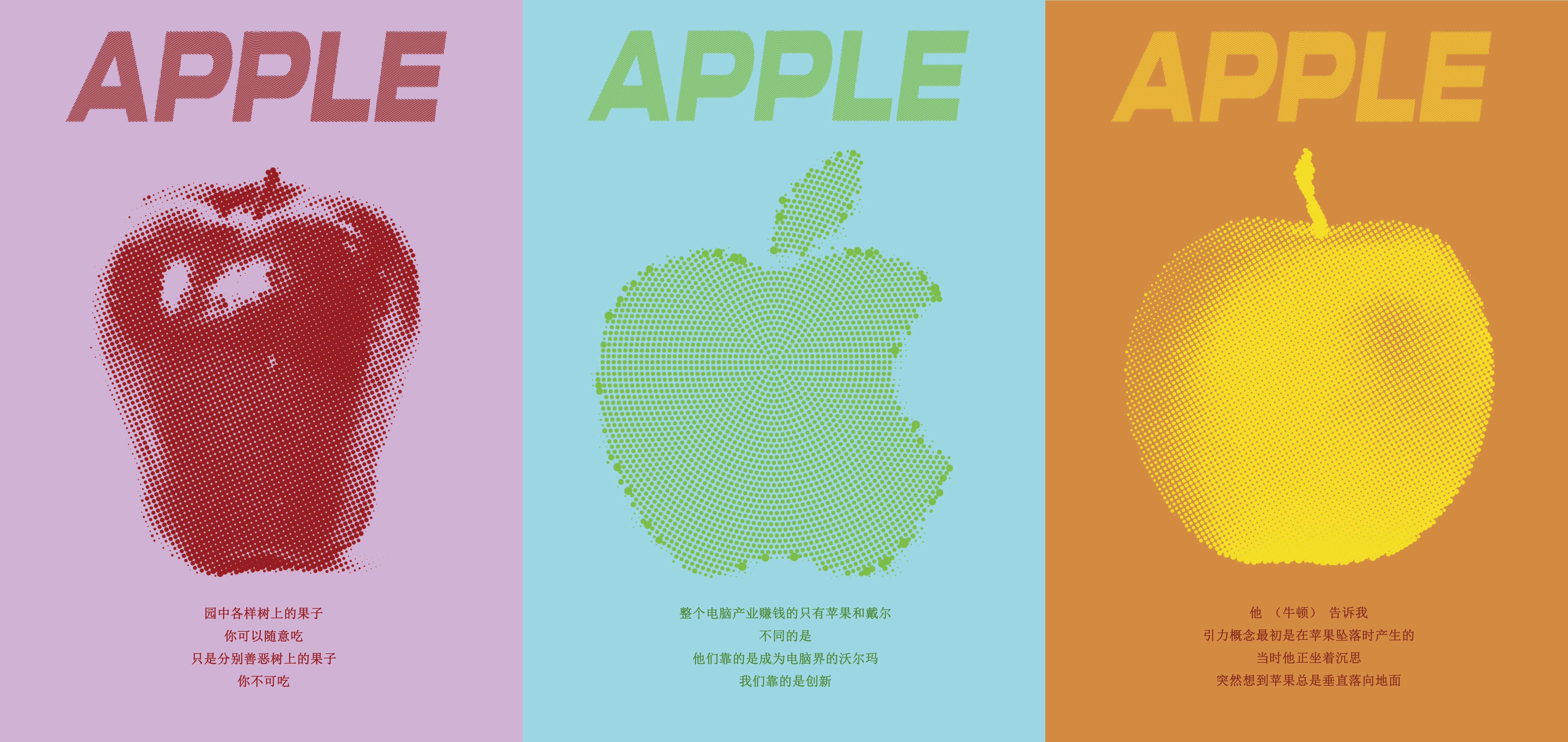 潘钰凤以“苹果”符号为叙事载体,选取伊甸园的禁果、牛顿的苹果与乔布斯的苹果三个典型意象,运用符号分层映射法构建“欲望-求知-创新”的认知进化图谱。