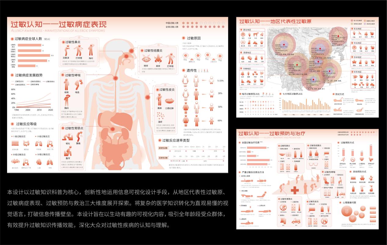 雷媚雯、袁雨璇本作品运用信息可视化设计和数字影像设计将复杂的医学过敏知识转化为清晰易懂的视觉语言。当作品构建起“预防过敏-识别过敏-应对过敏”的认知链条,成为一种社会关怀和知识科普的载体时,让我们感悟到设计的温度可以渗透到每个需要被看见的生命体验中。