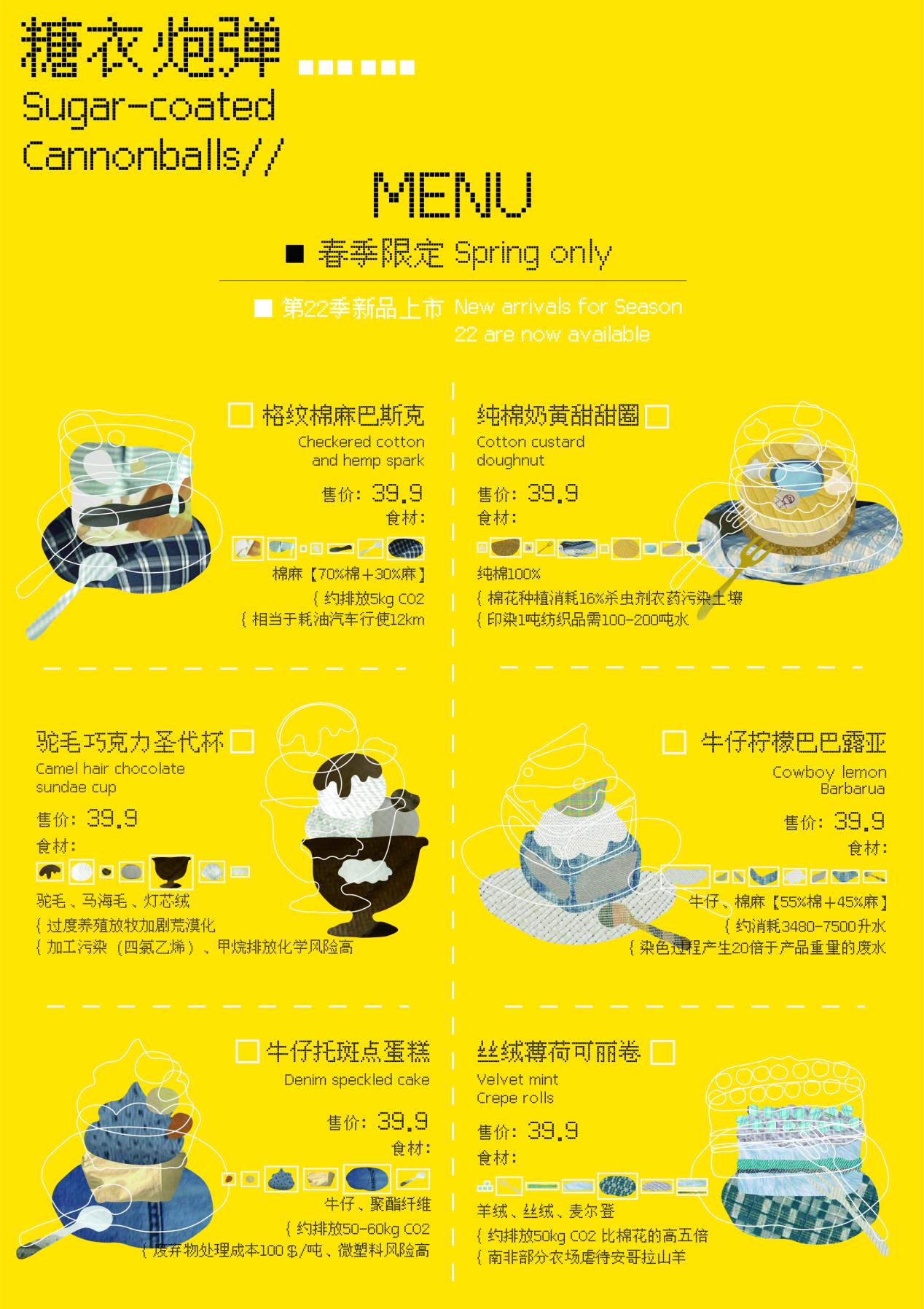 艾敬“糖衣炮弹”指通过“视觉隐喻”和“感官对比”深刻揭示了快时尚产业的本质矛盾。快时尚与甜品所存在的内在逻辑有着相似性,如通过视觉刺激消费,生命周期短暂,且都存在感知悖论等,既是“糖”又是“衣”通过元素的结合提供独特的切入点糖衣包裹炮弹的欺骗性揭秘了快时尚的“甜蜜消费”本质不然就是一场精心设计的生态谋杀。