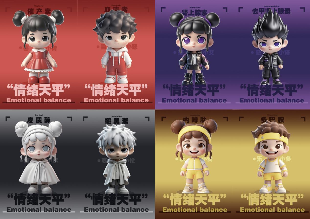 谢韵涵本设计源自指导老师主持的湖南省教育厅教研教改课题《数智时代背景下“人本+智创”设计人才培养路径研究》,聚焦于“Z时代”人群在现代社会重压下情绪易波动问题,以“情绪天平”公益主题开展IP形象设计。通过构建“喜怒哀乐”调节激素拟人化IP形象,让“Z时代”人群从中获取当下需要的情绪,并及时调节情绪达到平衡状态。