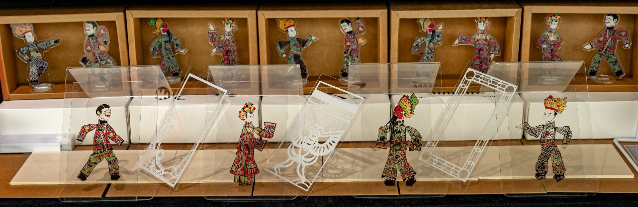 林明帆 曹芷睿本设计选取湘潭纸影戏角色中最具代表性的生、旦、净、丑为设计主体,从角色的传统纹样、配色,以及角色性格所匹配的动作姿态提取元素,运用传统手艺剪纸展示纹样、搭配AR技术展示角色动态,以卡牌为可交互的AR媒介,可通过自主搭配来展现不同的效果。