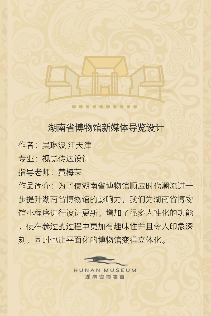作者:吴琳波 汪天津作品简介:为了使湖南省博物馆顺应时代潮流进一步提升湖南省博物馆的影响力,我们为湖南省博物馆小程序进行设计更新。增加了很多人性化的功能,使在参过的过程中更加有趣味性并且令人印象深刻,同时也让平面化的博物馆变得立体化。