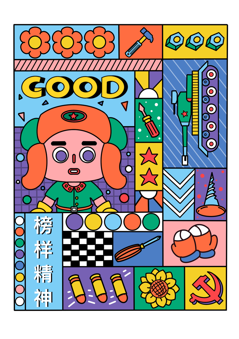 作者:顾晶晶作品简介:“好榜样”系列插画及文创设计整体采用的是孟菲斯风格。色彩丰富,颜色对比强烈,给人视觉上的冲击。绘制雷锋IP形象,结合雷锋同志使用过的物品及说过的话,使得画面丰富起来。既符合主题又具有独特性。