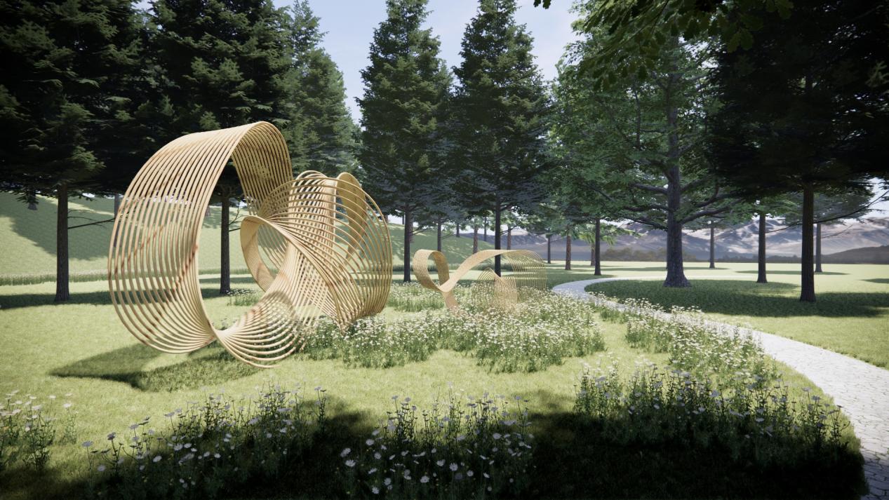 张锡华作品简介:“竹轮新启”在结构采用竹编工艺,融入环保竹缠绕技术,将传统与现代完美融合。作品形态多变,线条流畅,富有韵律感,展现出竹子的生命力与活力,也体现了余村对于传统工艺与现代科技结合的不懈追求。