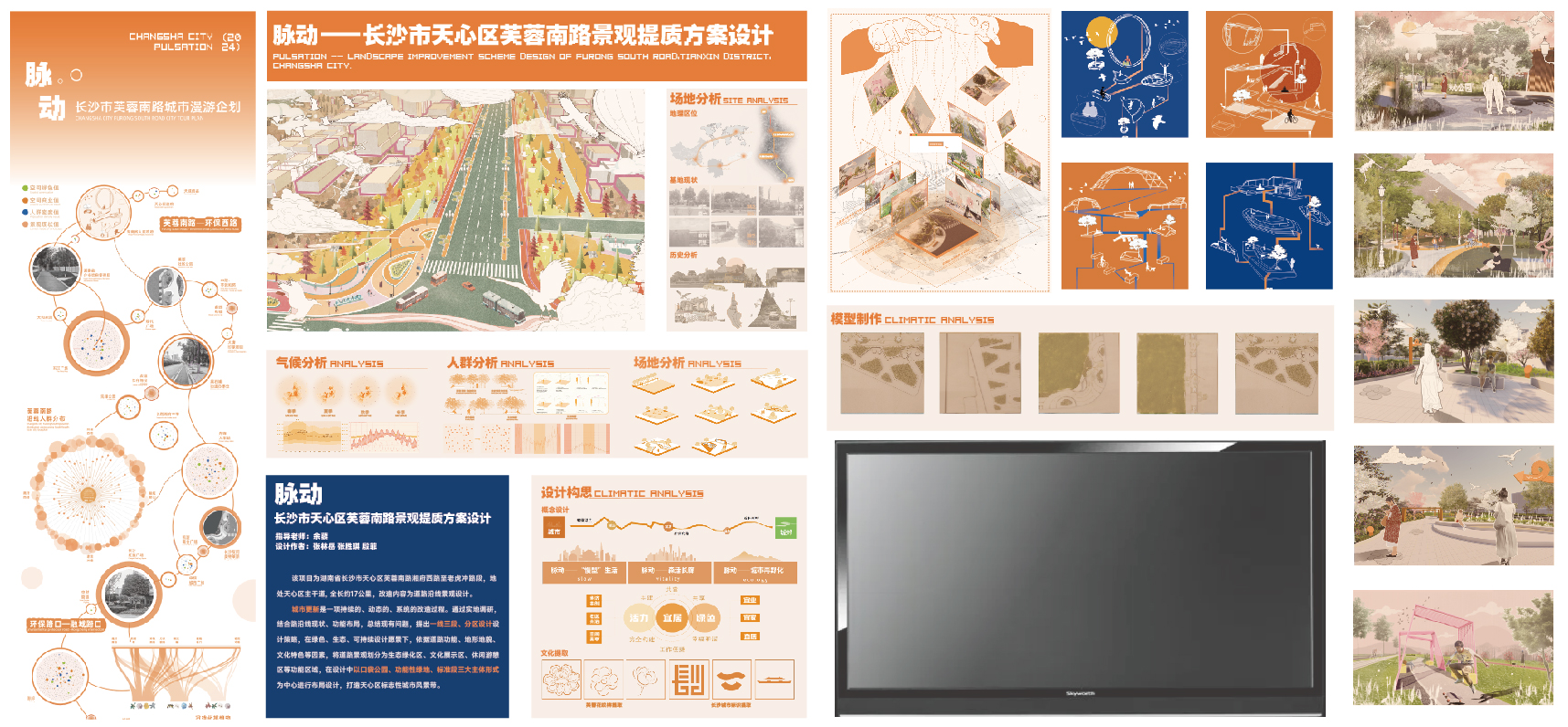 张林岳 张胜琪 殷菲作品简介:该项目为长沙市天心区芙蓉南路湘府西路至老虎冲路段,地处天心区主干道,全长约17公里,改造内容为道路沿线景观设计。通过实地调研,结合路沿线现状,总结现有问题,提出一线三段、分区设计设计策略,在绿色、生态、可持续设计愿景下,依据道路功能、地形地貌、文化特色等因素,将道路景观划分为生态绿化区、文化展示区、休闲游憩区等功能区域,在设计中以口袋公园、功能性绿地、标准段三大主体形式为中心进行布局设计,打造天心区标志性城市风景带。