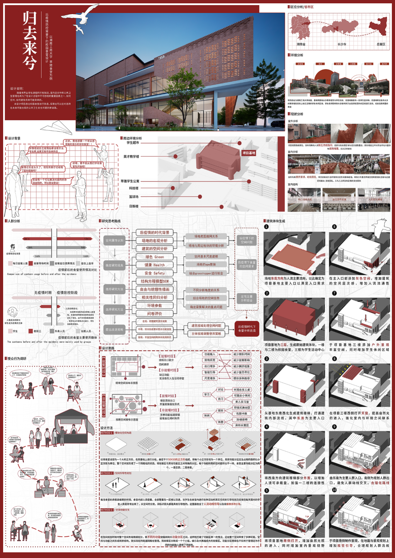 尹谢兵 胡捷作品简介:本设计项目以湖南工商大学萃雅食堂为例进行改造,探索出可以应对各种在未来可能出现的公共卫生安全问题的新道路。高校食堂作为集体生活和学习的场所,其食堂在保障师生健康方面发挥着至关重要的作用。传统的高校食堂在公共卫生方面存在诸多问题,如流线交叉、就餐拥挤等等。因此,对高校食堂进行改造以适应公共卫生需求已成为亟待解决的问题。