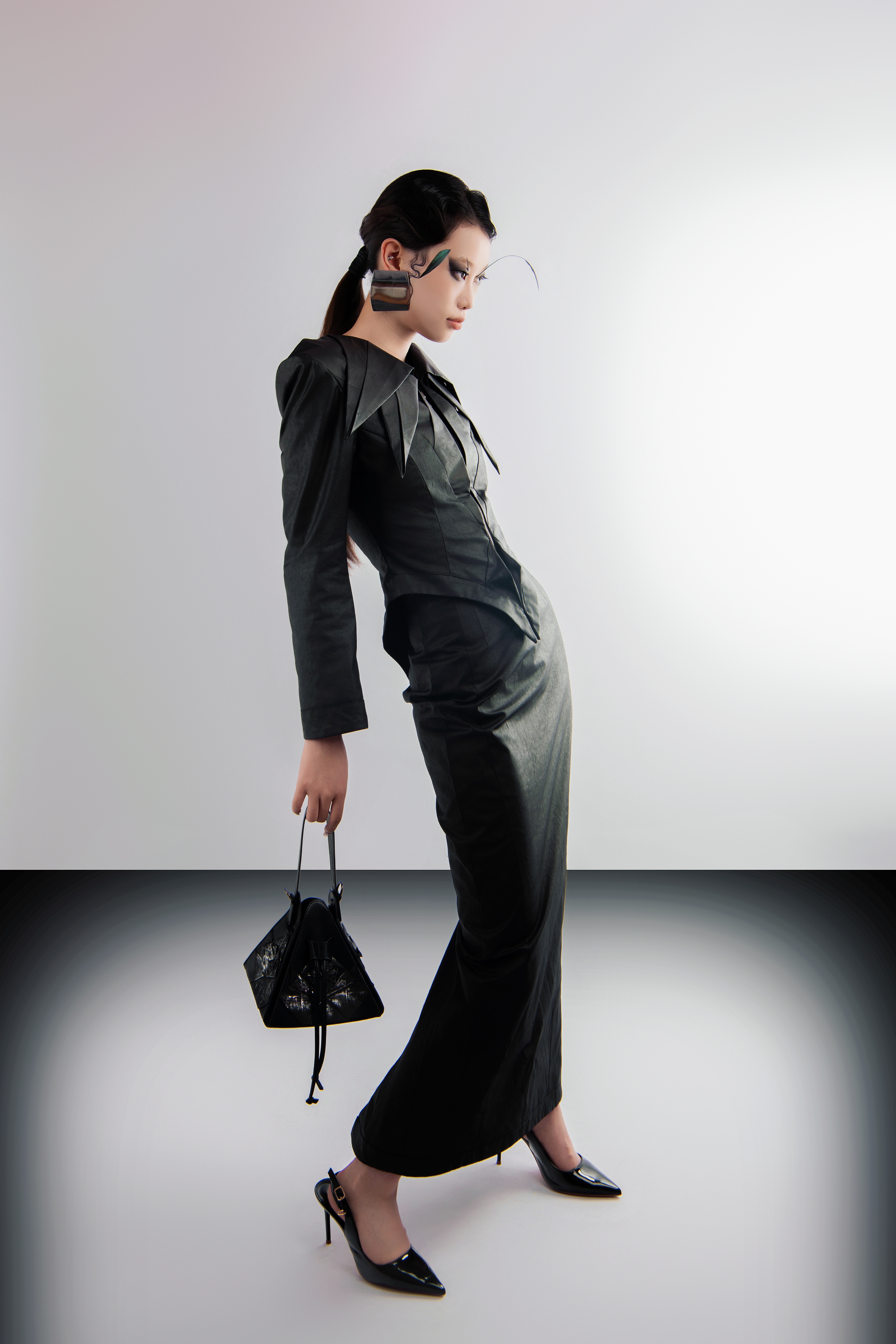 牛嘉苇作品简介:本次设计作品的主题为榫卯,以中国传统榫卯结构为源,从中提取榫卯一阴一阳、一转一折的思想关系和不同的榫卯构造方式,并将现代的模块化设计语言综合处理,与服装结构相嵌并转化为独立的部件。通过将服装设计与榫卯结构阴阳互补,展现独特的东方力量美学和中国传统的“天人合一”哲学思想。虚实相生,将榫卯叙述,回颂东方。