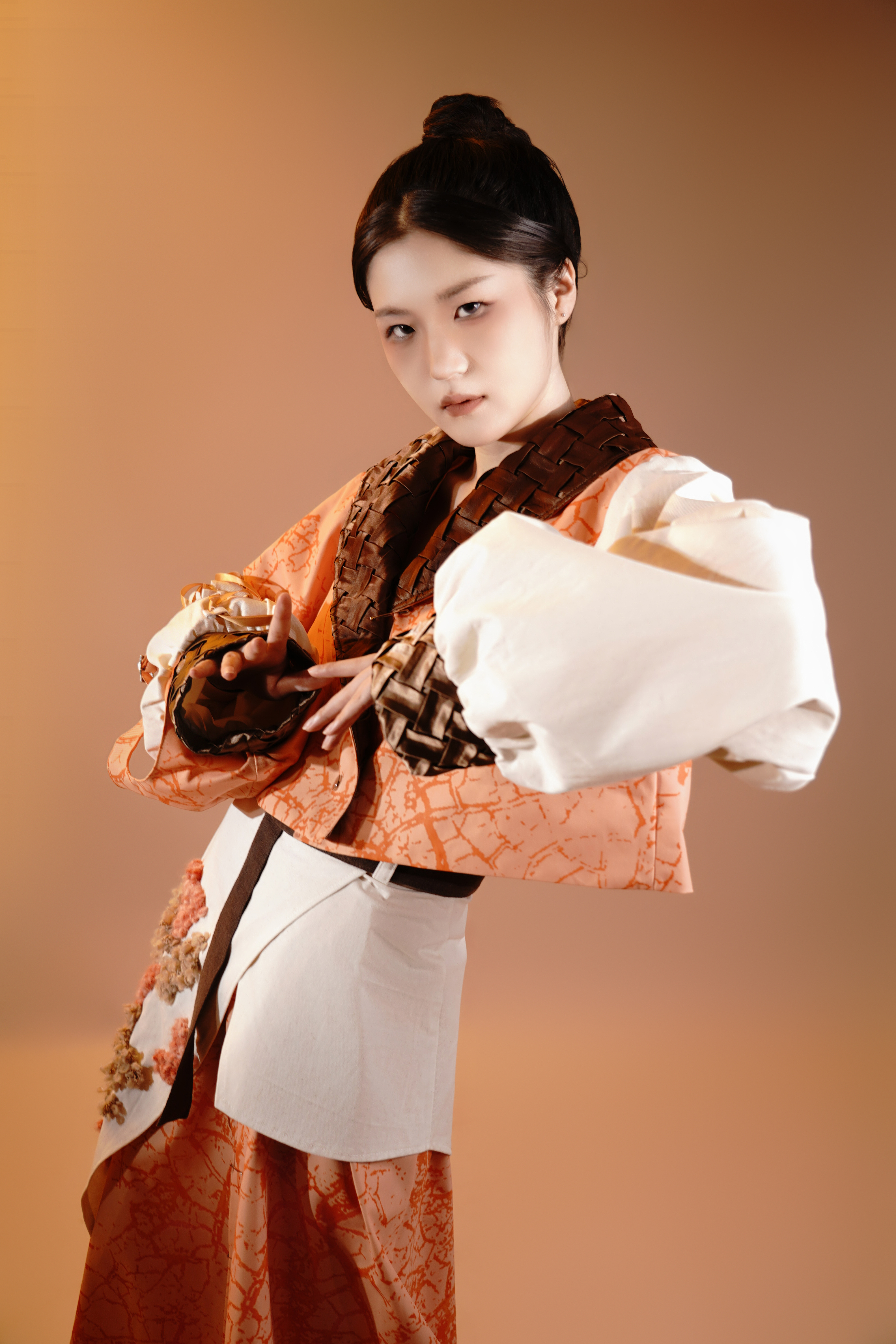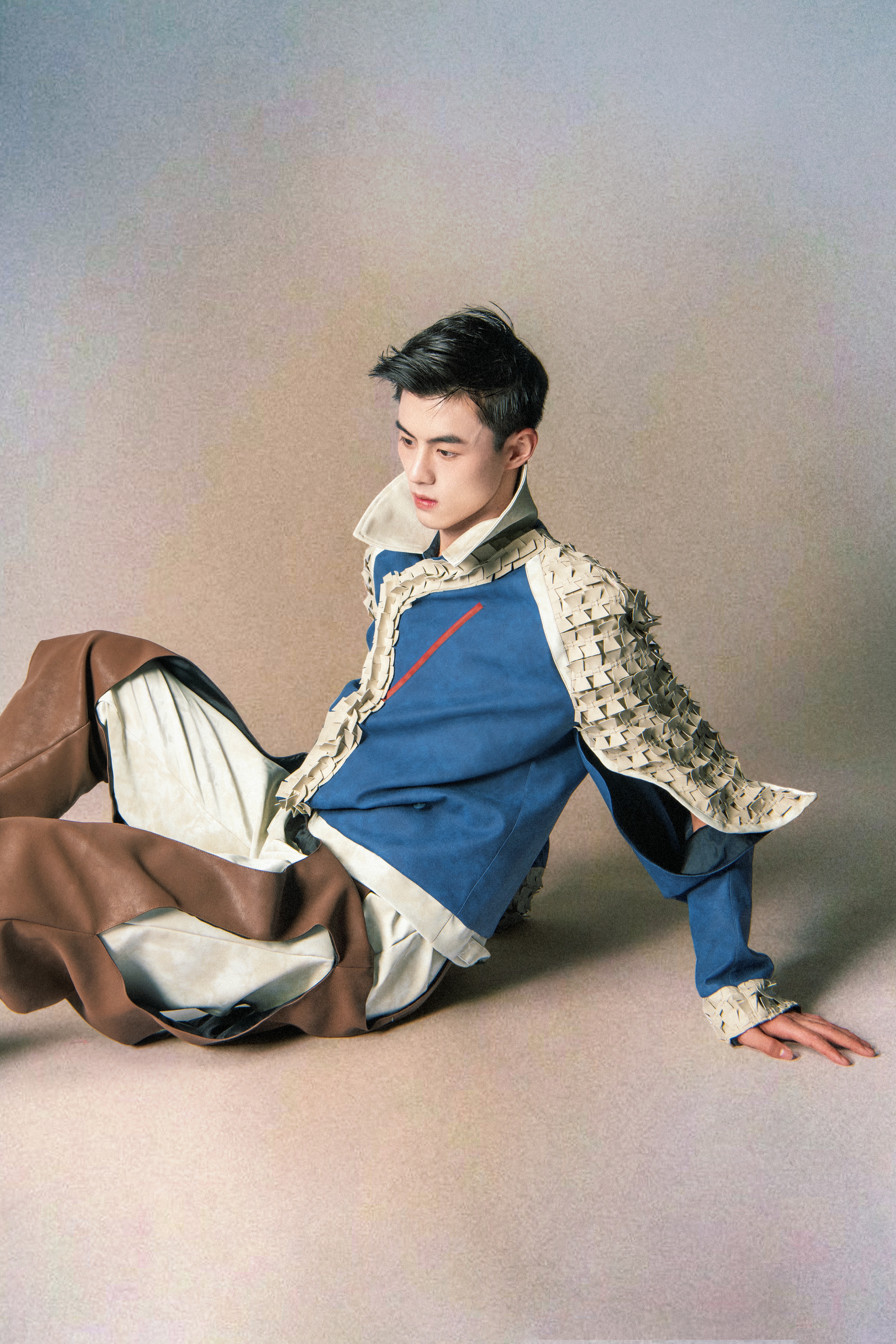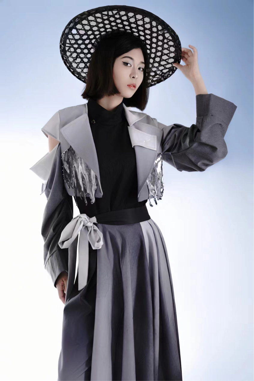 文婉婉作品简介:以侠客这一非常具有代表性的文化作为灵感来源,重新将侠客这一主题进行解构与突破,抽离出传统侠客的形象精选解构、重塑。国风与现代元素的碰撞于融和,结合游侠感自由飘逸的廓形设计。通过对传统侠客的服装分析与理解与现代服装进行结合创新。