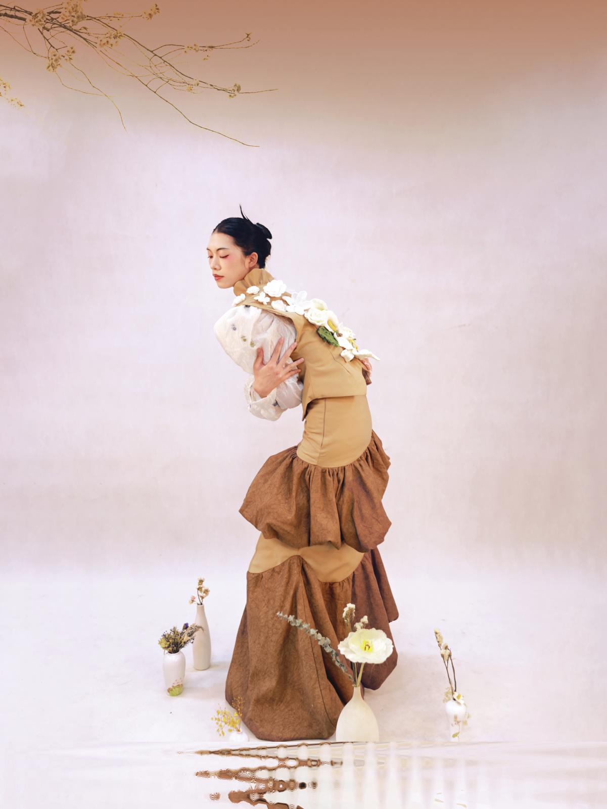 刘嘉悦作品简介:本次设计灵感来源于立体花卉。在快节奏的生活方式下,人们需要给自己一些时间沉静内心远离嘈杂的世界,探寻被我们遗忘的美好。将不会凋零的立体花寄托在衣着里,通过转身瞬间,传递出自然舒适,对大自然美好的向往和憧憬。