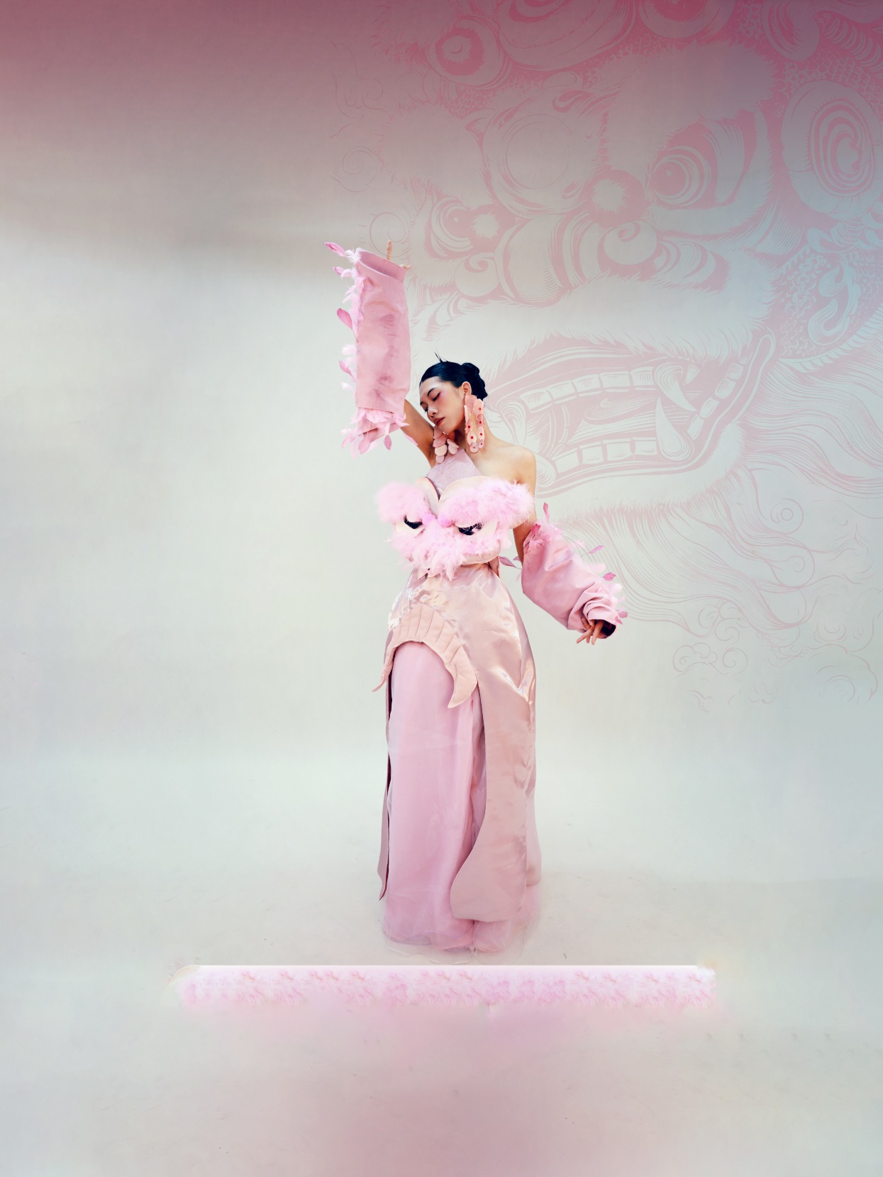 陈甜甜作品简介:醒狮不仅有着吉祥如意的寓意,也是勇敢和力量的代名词。将醒狮元素通过面料改造以及创新变形结合在服装设计中,开启设计师对醒狮了解的大门,让人们了解知道中国文化。