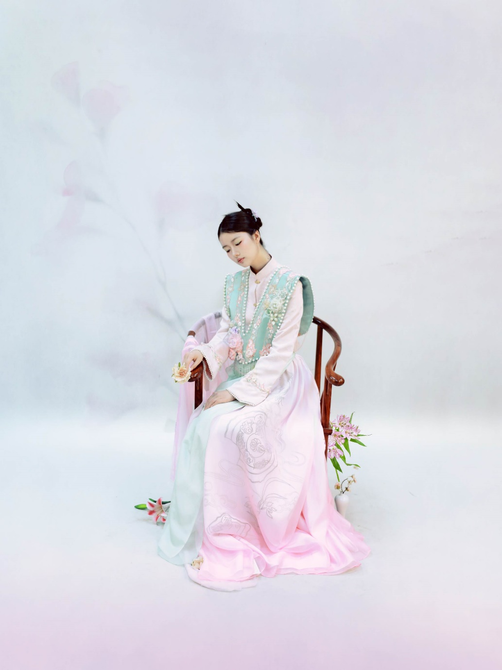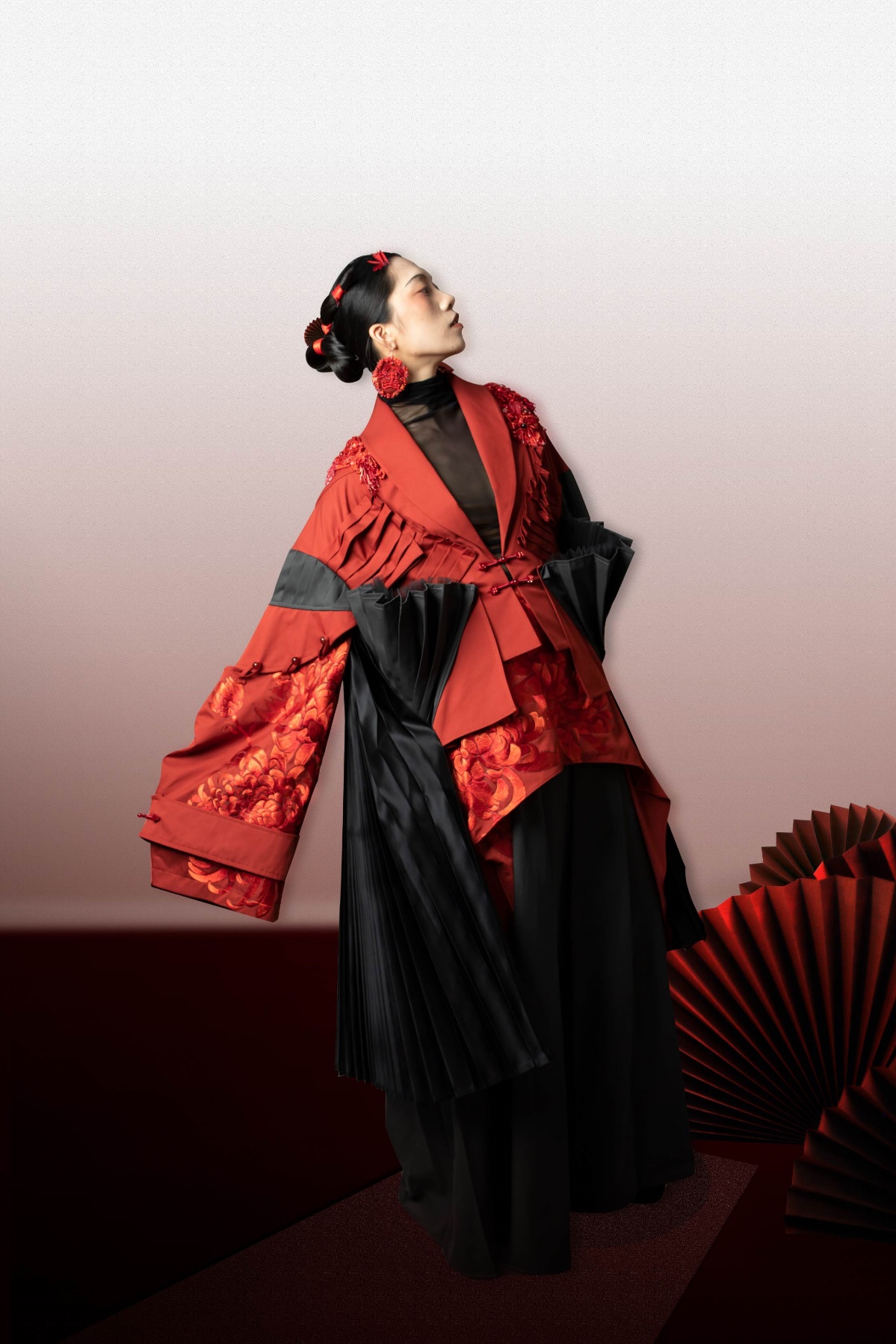 余悦作品简介:本系列设计灵感来源于经典名著《红楼梦》。《红楼梦》是中华之瑰宝,亦是民族自信的源泉之一。笔者通过对《红楼梦》原著研读,以书中金陵十二钗为设计灵感,选择《红楼梦》中“金陵十二钗”中的人物形象以及典型的非遗技艺,提取了十二钗花卉元素进行图案设计,在设计过程中,根据书中对“金陵十二钗”人物形象特征的描写,以及各自判词的不同,总结出“金陵十二钗”的共性;再结合国潮风格趋势,将明清服饰中的马面裙与折纸册子进行融合设计,打造富有中国风风格的服装。