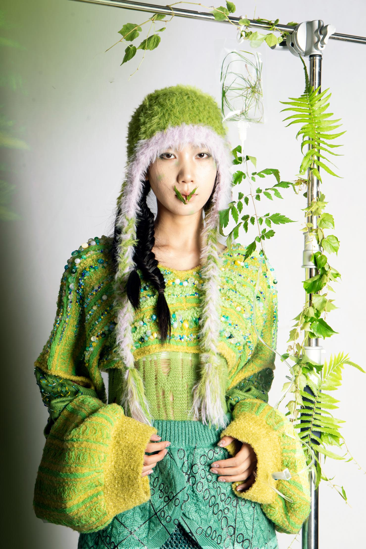 李慧宁作品简介:本设计以植物组织结构为设计灵感来源,以针织手法作为表现形式。首先,植物的组织结构,特别是在细胞层面,可以看作是由许多细胞通过细胞壁互相连接而形成的复杂网络。这些细胞不仅仅是静态的结构单元,它们通过细胞间的相互作用和物质的转移,共同维持植物的生命活动。类似地,针织结构由一系列的环和针织纱线交织而成,形成了一个既有弹性又有强度的布料。每一环或“针脚”都依赖于相邻的环来保持其位置和结构完整性,这种依赖关系确保了针织品的整体性和功能性。此外,植物的组织结构和针织结构都展示了极高的适应性和多功