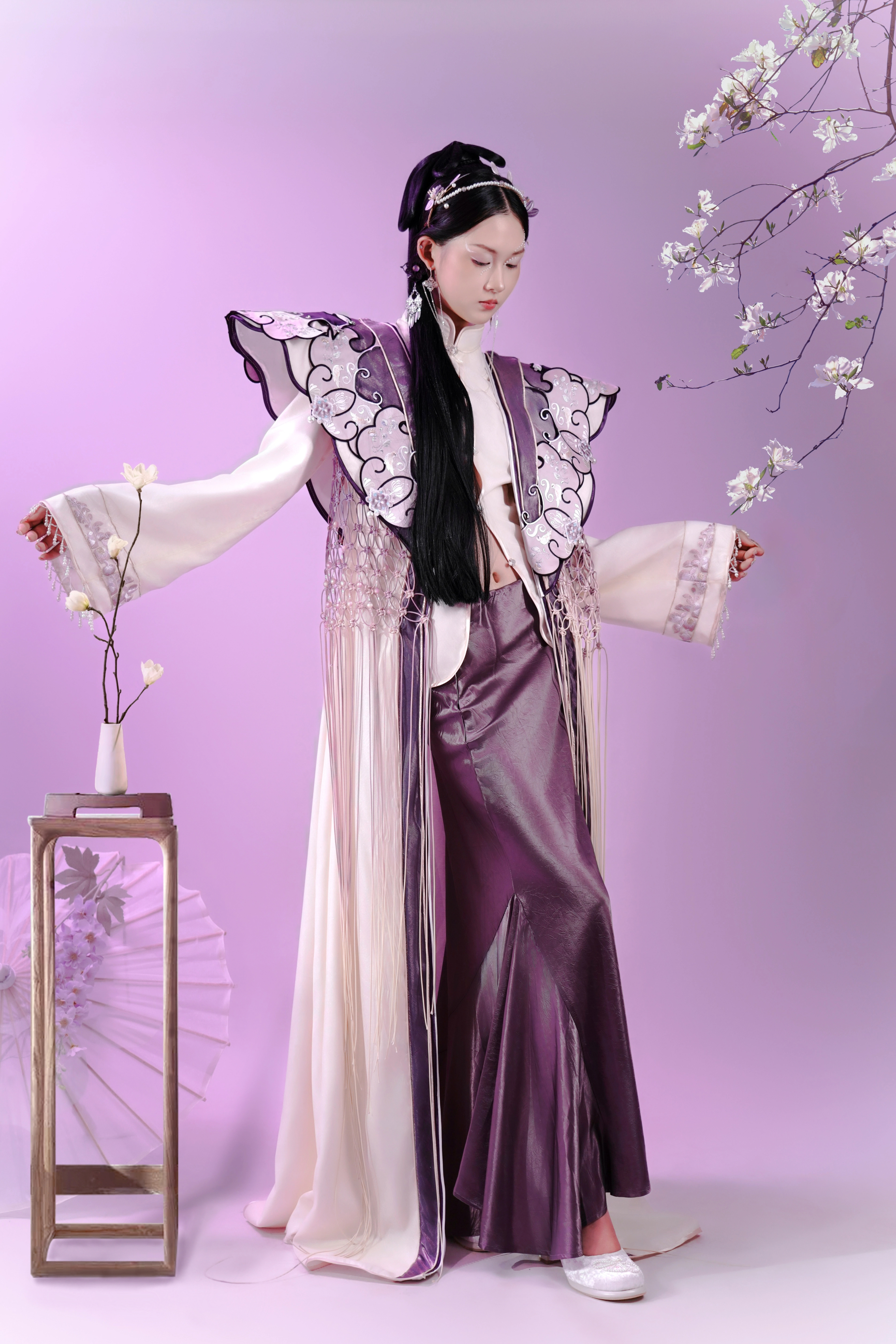 王菁菁作品简介:主题灵感源于对中国传统文化和汉服的热爱,以及对清代云肩这一经典元素的着迷。云肩作为古代服饰的瑰宝,融合了历史、文化和艺术,具有丰富的形态和内涵。通过将其融入现代服装设计,期望传承和创新云肩的精髓,探索其在当代时尚中的新可能。本系列作品以清代云肩在服装上的应用为出发点进行设计,从造型,工艺,面料等角度进行面料实验,面料改造。深入挖掘云肩的历史文化内涵与艺术价值,将云肩以艺术的形式应用在现代服装上。