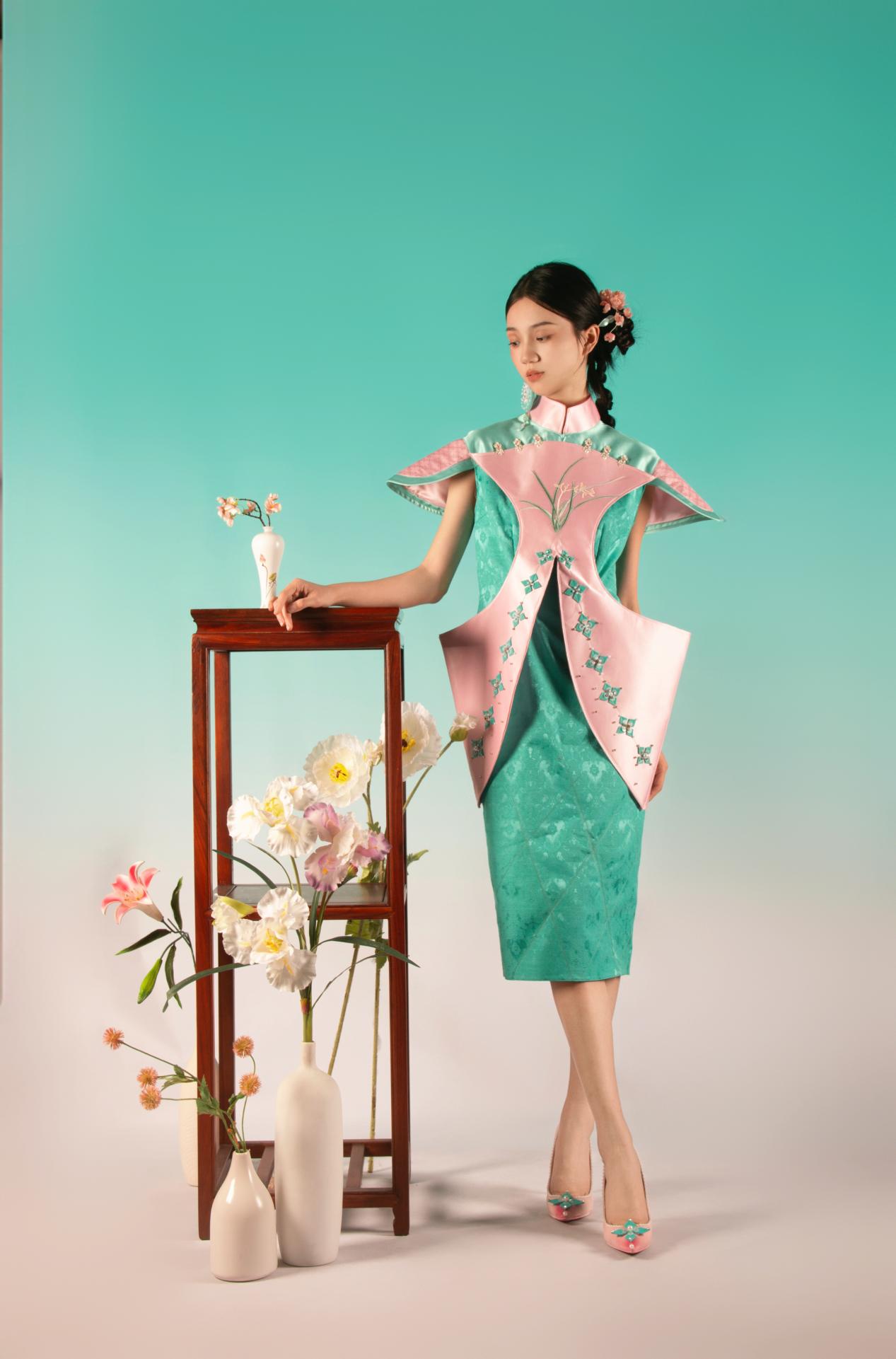 黄婧作品简介:大三下学期外出考察时,在深圳博物馆参观了“混融中西,绚彩华丽——清代广东金属胎画珐琅特展”,领略了清代广东金属胎画珐琅的独特魅力。毕业设计,我以此为灵感,将清代广东画珐琅元素融入到现代服装中,提取了广彩锦地开光徽章折枝花卉纹瓷盘、广彩锦地开光人物图盘以及广彩徽章花卉纹盘中的基础纹样,造型上参考了折枝花卉纹壁瓶、双头鹰纹茶叶罐和开光西洋人物图壶等。色彩提取清代广东金属胎画珐琅工艺品中最具特色的粉蓝绿,主要以广彩锦地开光徽章折枝花卉纹瓷盘中的粉绿为主。工艺上主要以钉珠为主,使服装整体更加
