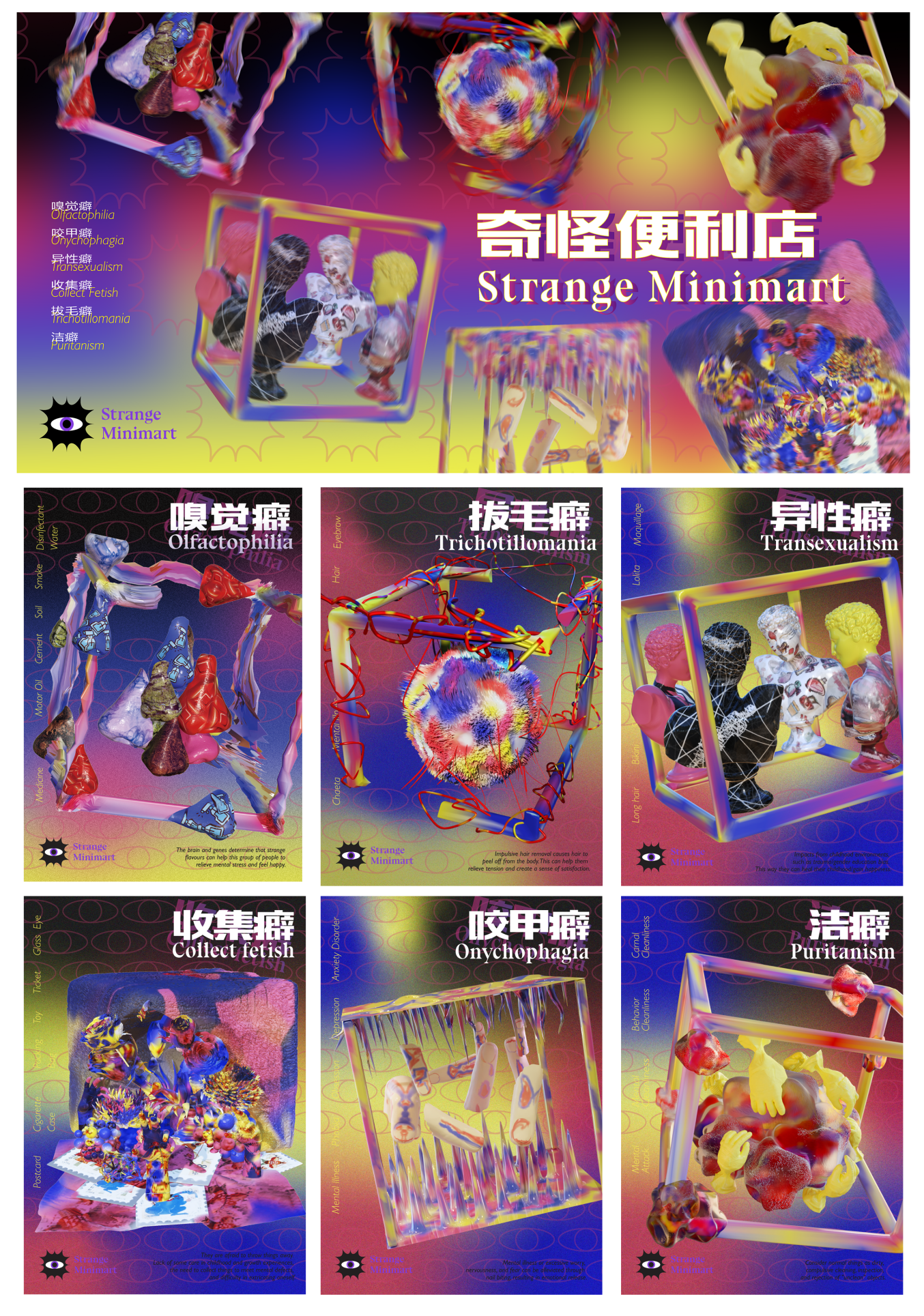 赵丹阳作品简介:本设计对“奇怪便利店”视觉识别流程与相关模型进行制作,提取怪癖人群的性格特征、行为、遭遇以及心理感受等元素添加到模型中,利用3D建模的方式展现怪癖人群的生活状态与心理状态,运用饱和度高、对比度强的色彩呈现整体视觉。在此基础上围绕怪癖模型构建出潮流新颖与年轻化的整体形象设计,以此促使人们理解尊重怪癖人群,也鼓励怪癖人群正视自己,勇敢求助与治疗。