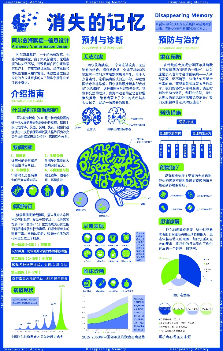 赵静作品简介:“消失的记忆”是以阿尔兹海默症为主题的信息设计。针对我国阿尔兹海默症就诊率低、治疗率低、依从性低的问题进行宣传和科普。让更多的人对此病引起重视,从而做到早发现,早治疗,达到延缓病情发展的目标。