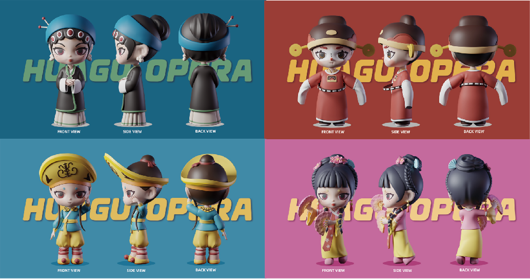周星灿作品简介:本设计旨在将传统花鼓戏与虚拟技术相结合,通过创新的方式让更多人了解和喜爱这一传统艺术形式。设计在保留传统花鼓戏精髓的基础上,融入现代审美与流行元素,使IP形象既具有传统韵味,又符合现代审美标准。设计选取了花鼓戏中的四个典型角色——旦、生、丑、老旦,通过IP形象化的方式,赋予他们新的生命力和时代感。