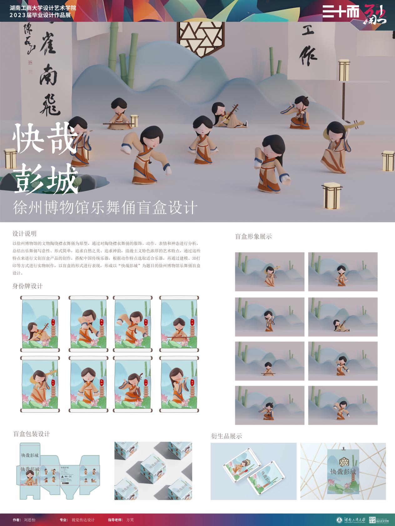刘思怡作品简介:本次设计以徐州博物馆的文物陶绕襟衣舞俑为原型,通过对陶绕襟衣舞俑的服饰、动作、表情和神态进行分析,搭配中国传统乐器和徐州当地景点,形成以“快哉彭城”为题目的徐州博物馆乐舞俑盲盒设计。