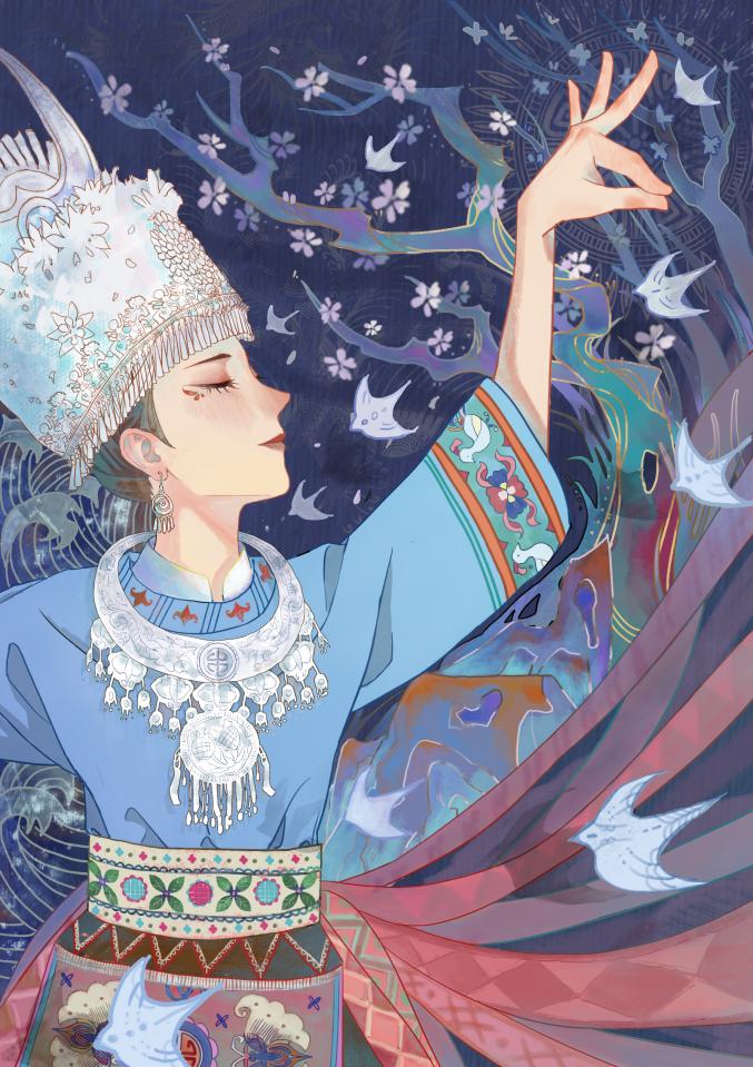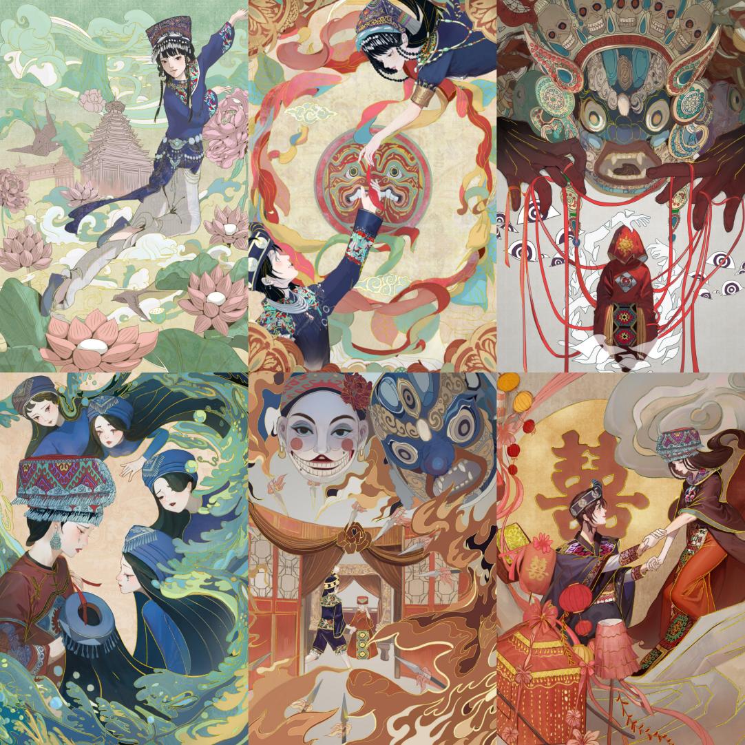 唐梦婷 胡月月作品简介:本项目主要将苗族锦鸡舞相关的舞蹈、服饰、习俗等特色文化元素,了解锦鸡苗族的历史故事、民俗文化的文化魅力,提取其中重要部分作为插画中装饰元素,绘制民族文化插画,在具有表面的辨识度之上,从而提升画面中的内涵,最后将其组合进行文创与衍生品设计。