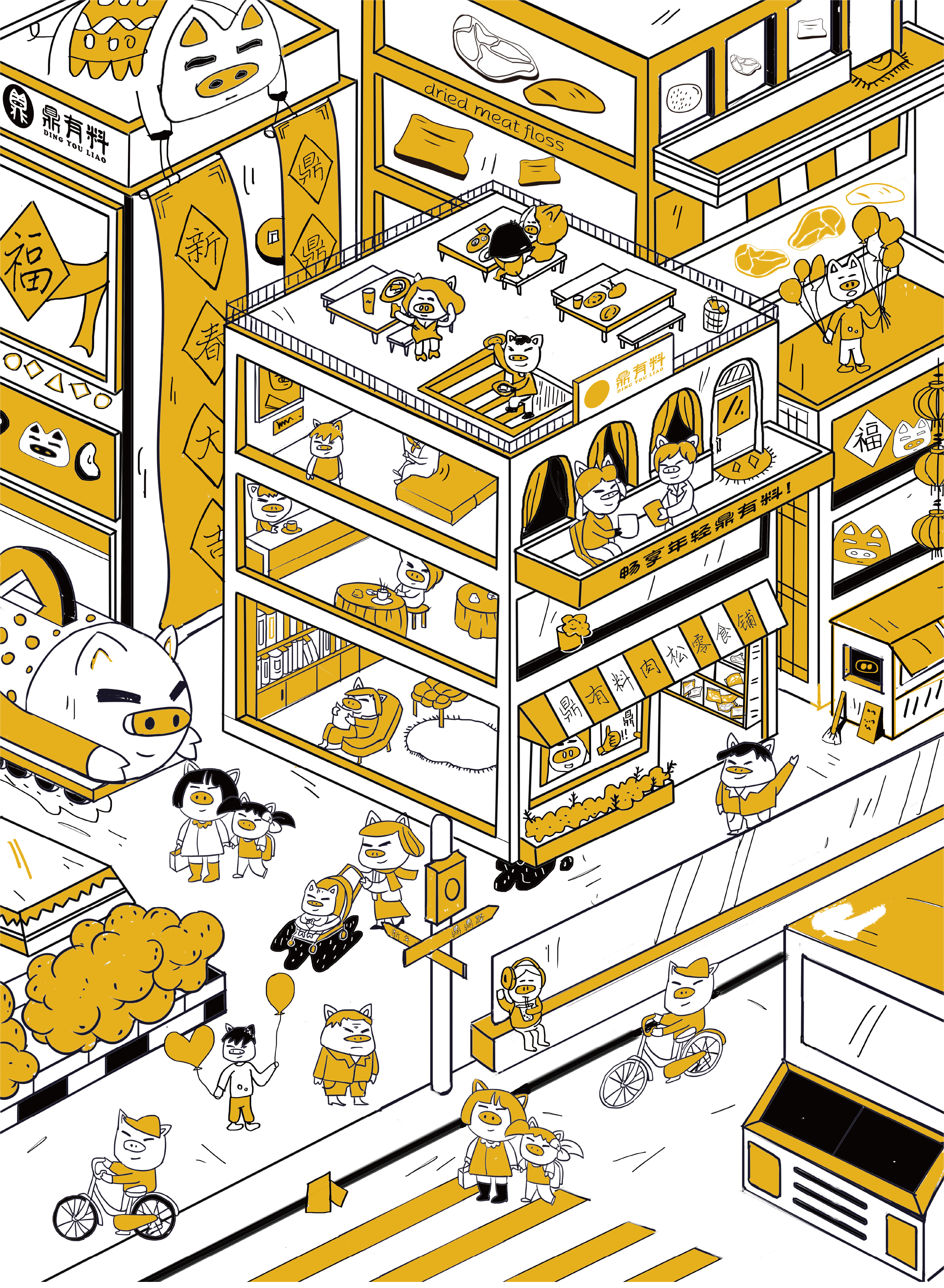 王晨阳作品简介:鼎有料设计中运用“以小见大”法,对logo主体形象进行强调、取舍、浓缩,以猪鼻子和篆体“鼎”字延伸放大,插画设计中运用“联想法”描绘了一个新年主题的画面,形形色色的小人在零食铺吃肉松,增加了画面的喜感,具有很强的代入感,吸引更多的消费者。