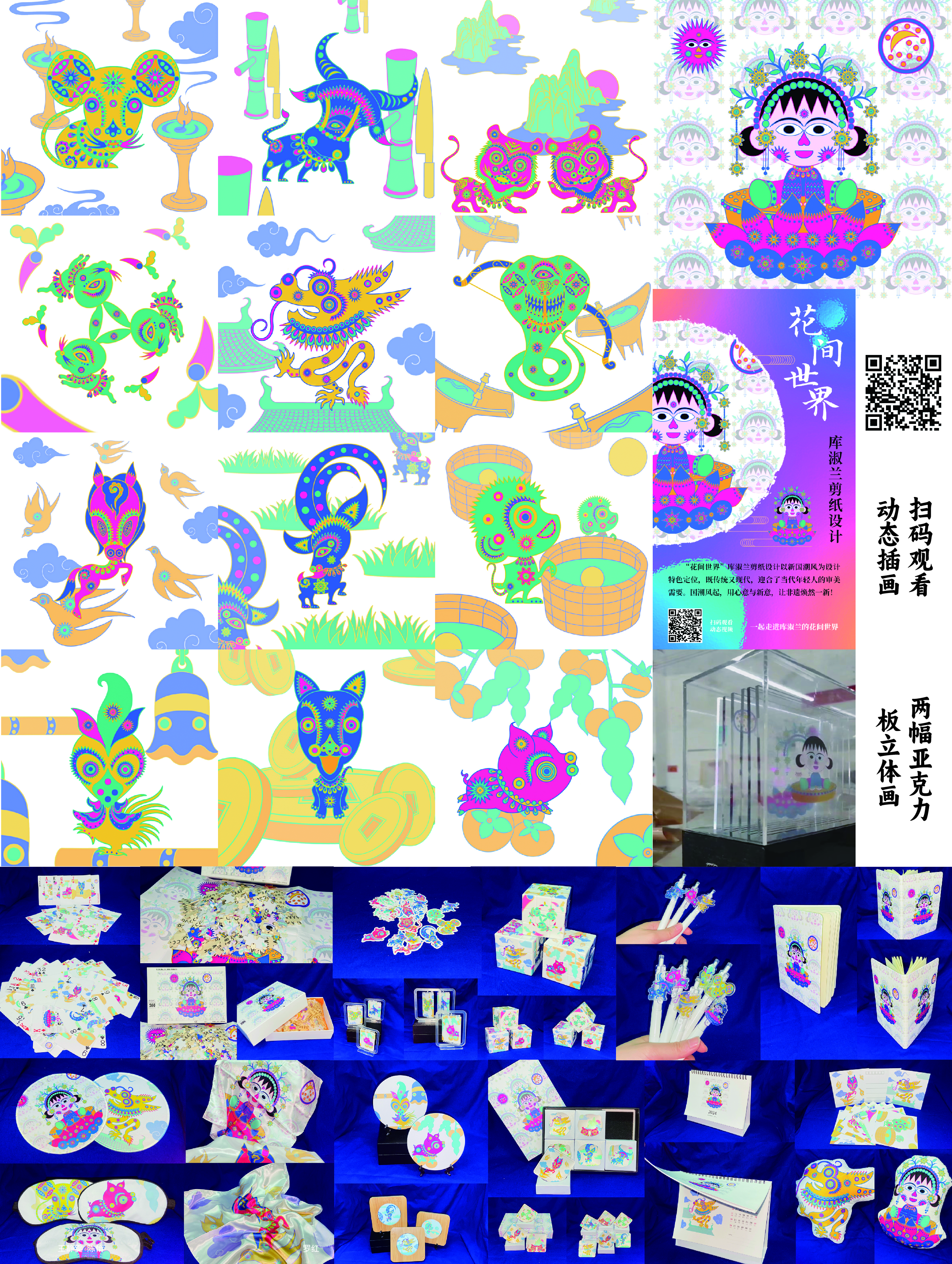 王静雯 陈怡作品简介:“花间世界”库淑兰剪纸设计以新国潮风为设计特色定位,将十二生肖以及剪花娘娘变身“大头娃娃”,结合库淑兰剪纸中明亮的色彩以及丰富的纹样进行创新再设计,引用相关民风民俗、典故传说来介绍十二生肖以及剪花娘娘,国潮风起,用心意与新意,让非遗焕然一新!
