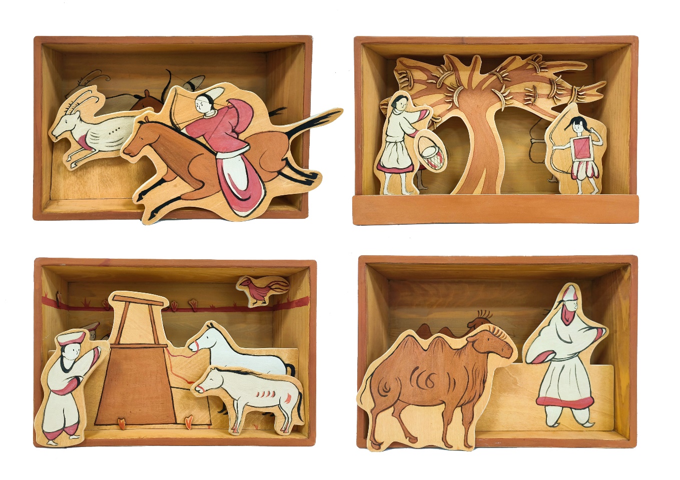 王欣仪作品简介:该作品将魏晋墓博物馆的壁画与质朴的木头相结合进行再设计,通过木盒、木板与岩彩的结合把每幅小画面的插图进行层次分割,融入了一定的趣味性,以期引起更多人对魏晋墓中文化的关注。