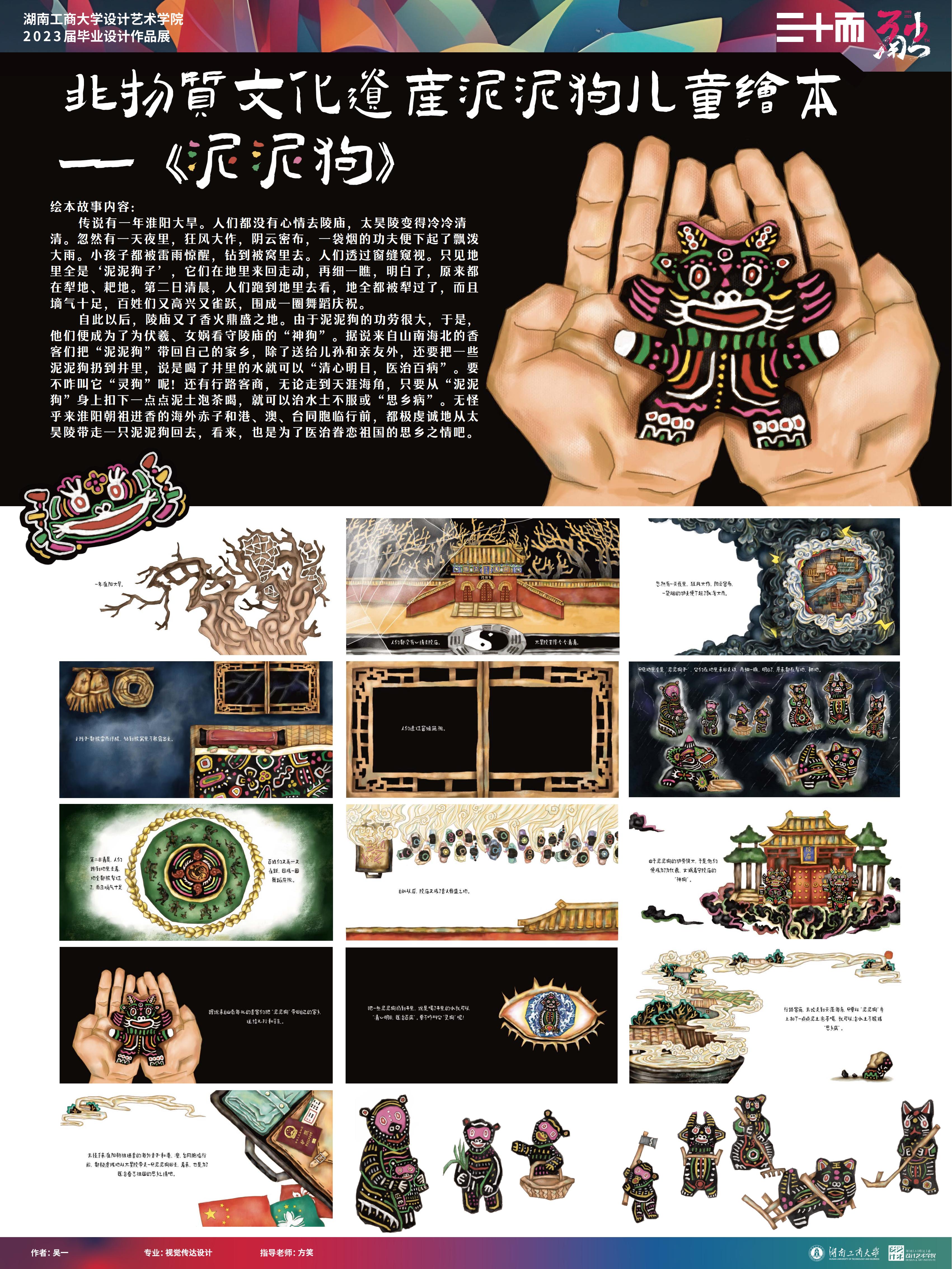 吴一作品简介:非物质文化遗产泥泥狗,是来自豫东淮阳民间的一种手捏泥玩具,具有浓厚的乡土民俗气息,素有“真图腾、活化石”之称,也是淮阳县一年一度的淮阳庙会不可或缺的“吉祥物”。本设计以泥泥狗的来源传说为主题,进行绘本和衍生品设计,以此达到文化与传播相结合的目的。