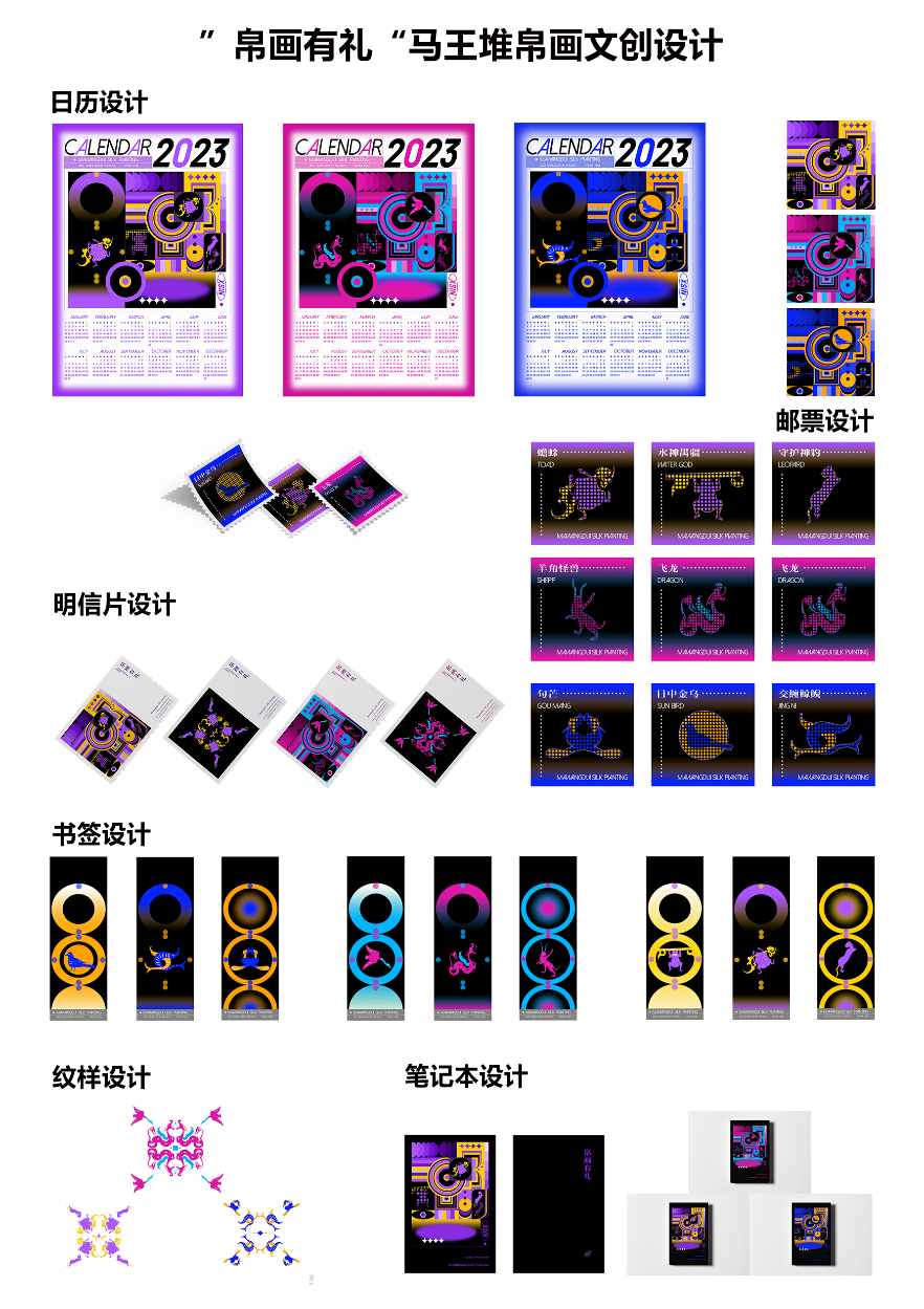 谢诗茵作品简介:设计通过帛画画面表现得启发,在帛画原来线描的基础上提取出图形元素并进行更加吸引当代年轻人的设计,如抽象设计、点阵化设计等等。其中设计的图案以及插画做成邮票、日历等文创,打造一份专属于马王堆帛画的礼物。