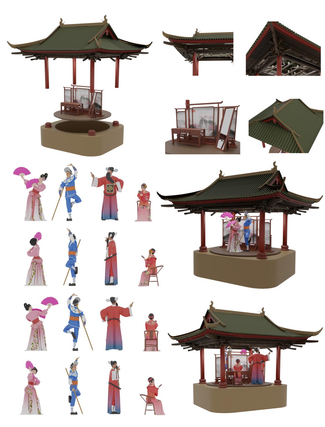 徐蓓蕾作品简介:本次设计的目的是希望通过对花鼓戏的深入研究,提取出花鼓戏的传统元素,从而将花鼓戏和音乐盒结合起来,打破传统的戏曲展示,同时围绕花鼓戏的主题,将音乐盒打造成古戏台结构,戏台中的人物栩栩如生,动作夸张生动,服饰短衣长袍皆有涉及,尽量展示出花鼓戏服饰的特色。