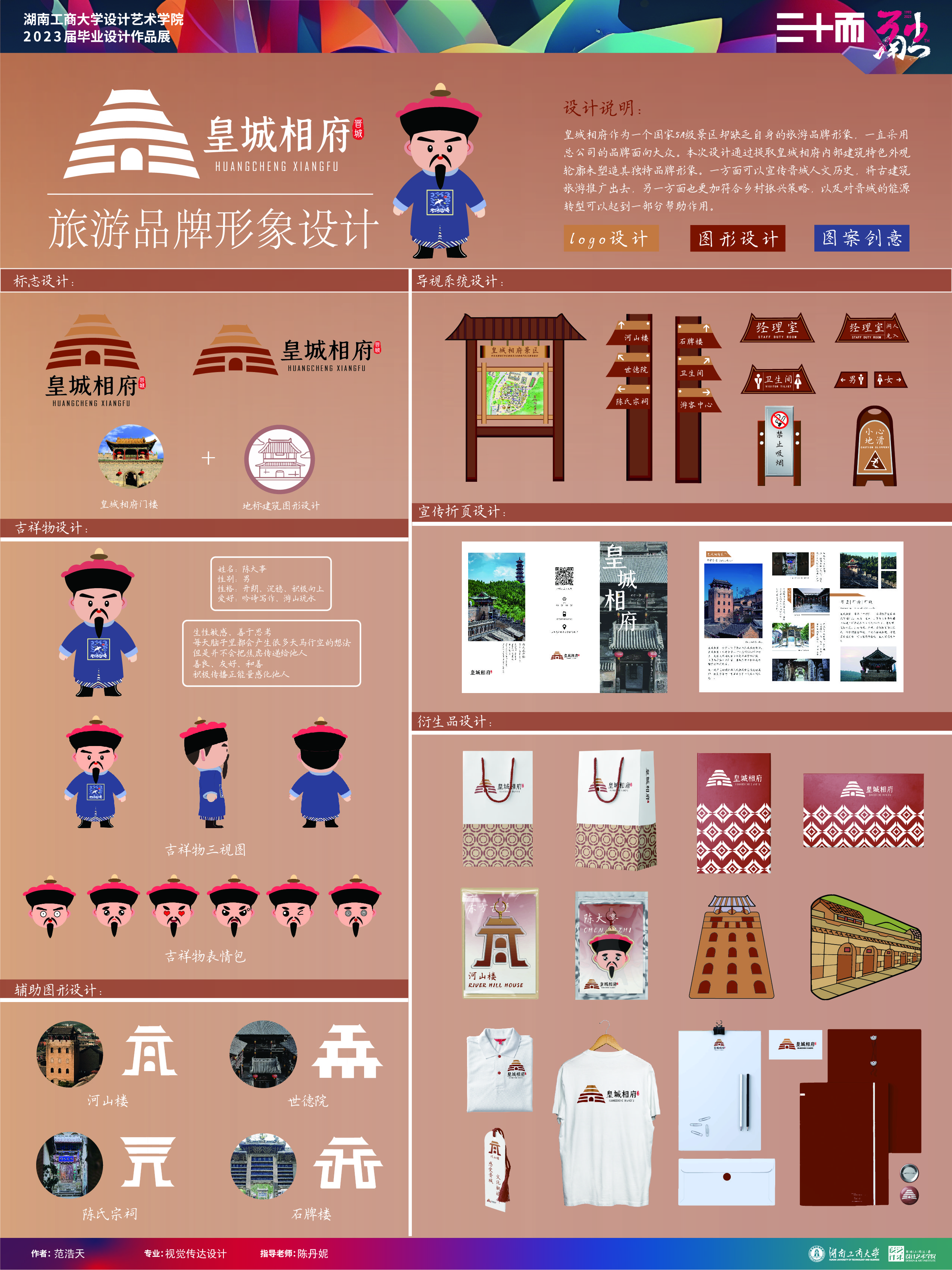 范浩天作品简介:皇城相府作为一个国家5A级景区却缺乏自身的旅游品牌形象,一直采用总公司的品牌面向大众。本次设计通过提取皇城相府内部建筑特色外观轮廓来塑造其独特品牌形象。一方面可以宣传晋城人文历史,将古建筑旅游推广出去,另一方面也更加符合乡村振兴策略,以及对晋城的能源转型可以起到一部分帮助作用。此次设计从logo、辅助图形、导视系统、海报、宣传折页、事务用品几个方面进行展示。